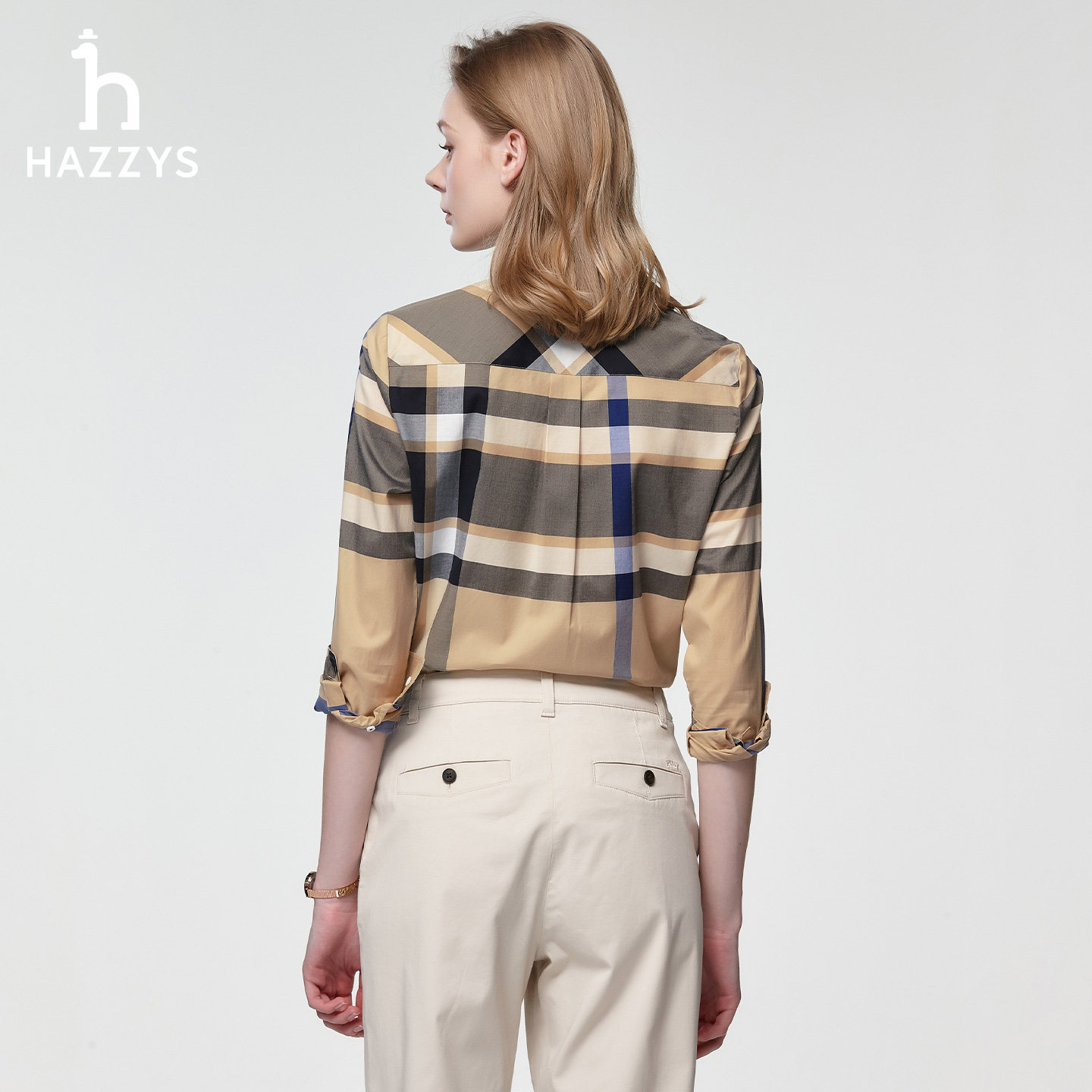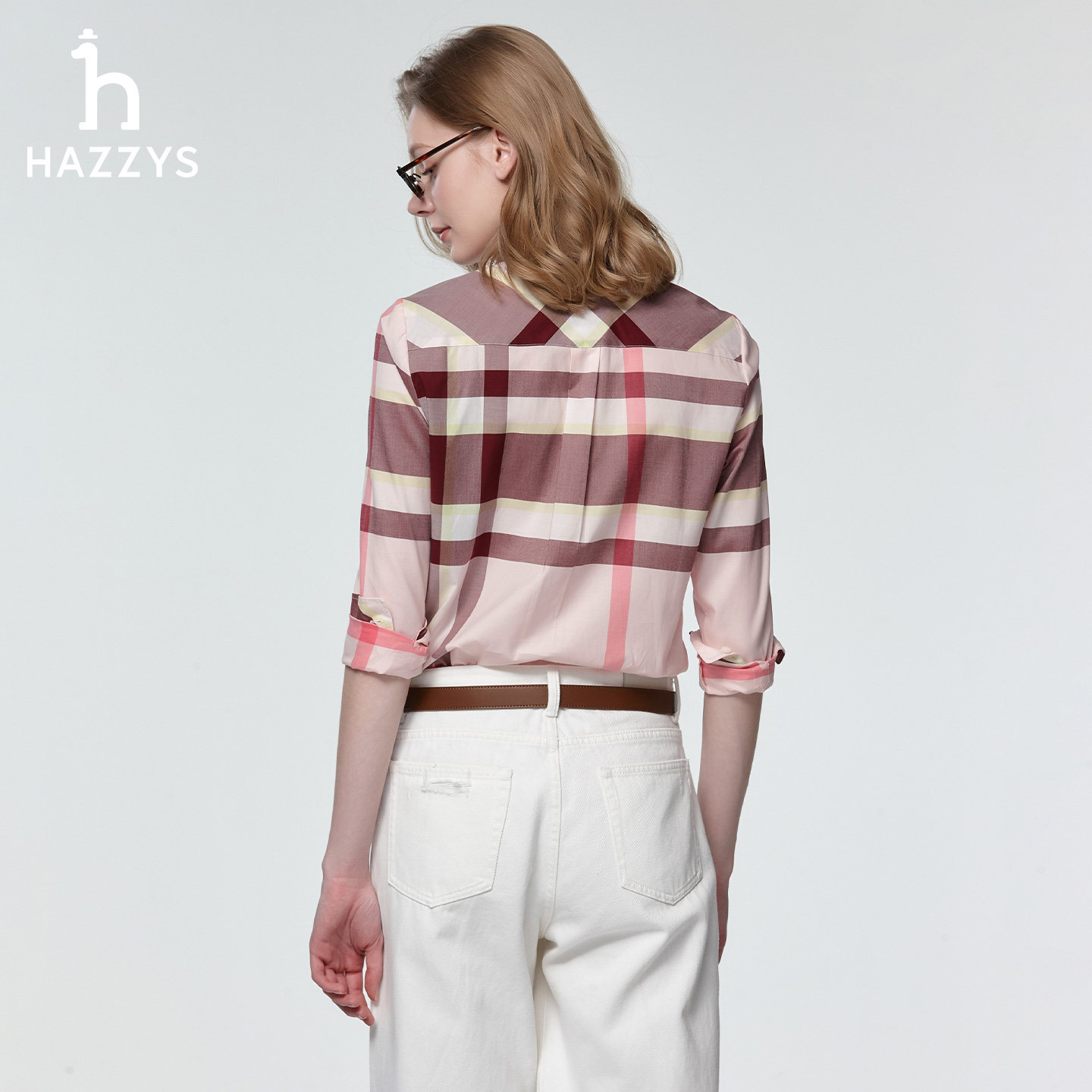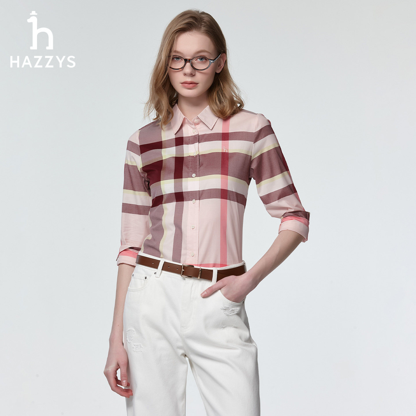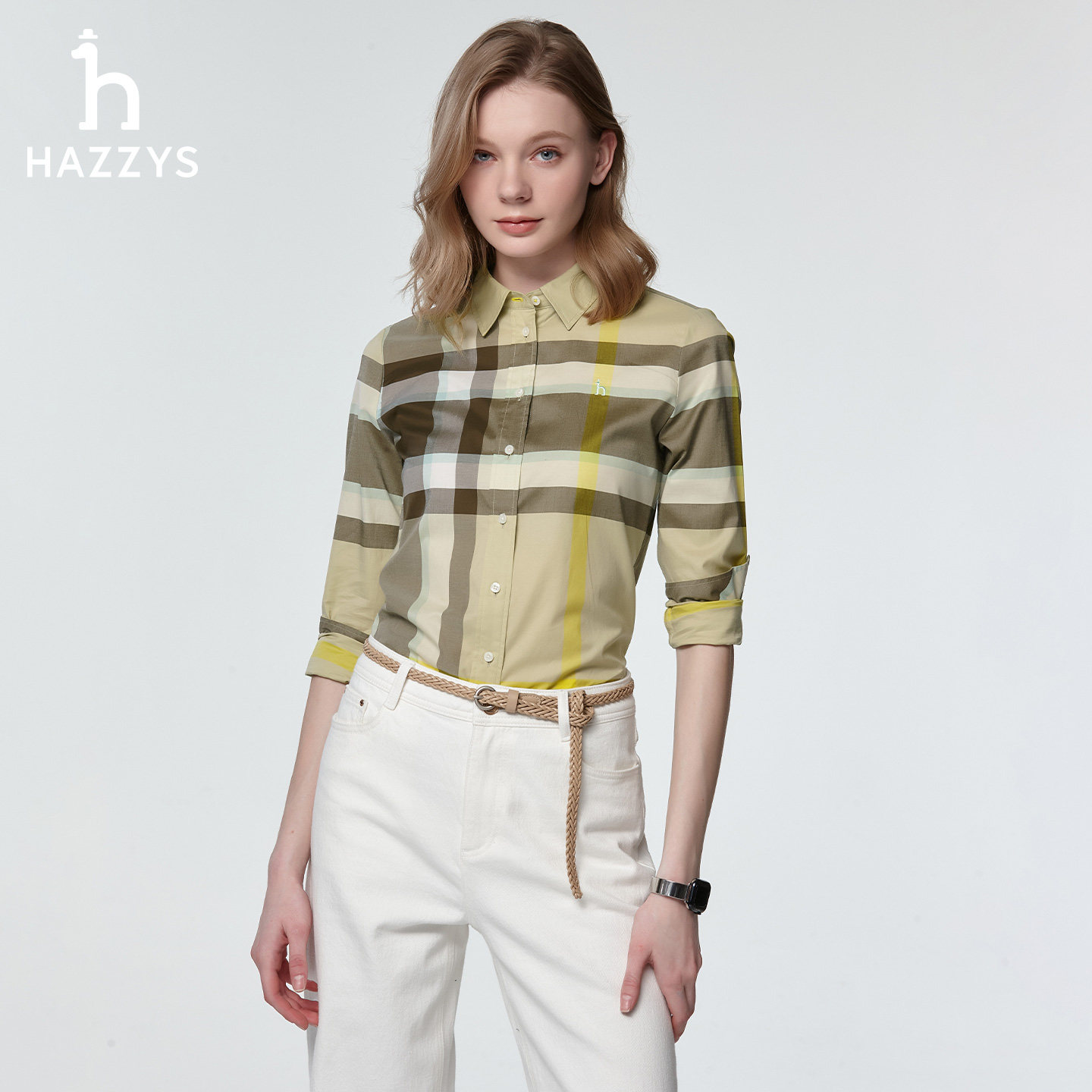 📚 Hazzys哈吉斯女士长袖多色翻领大格纹衬衫上衣女春夏时尚休闲衬衣