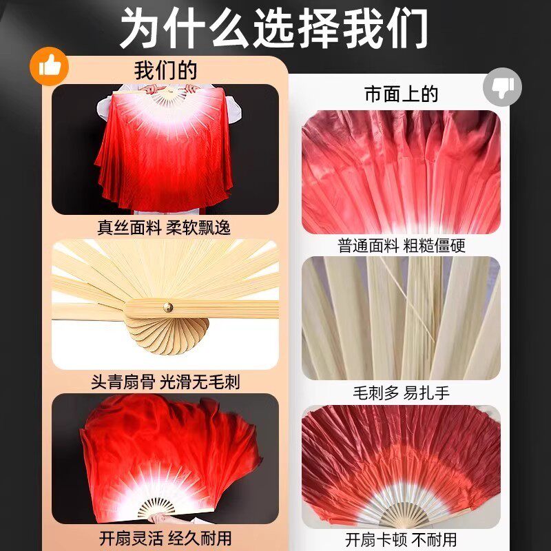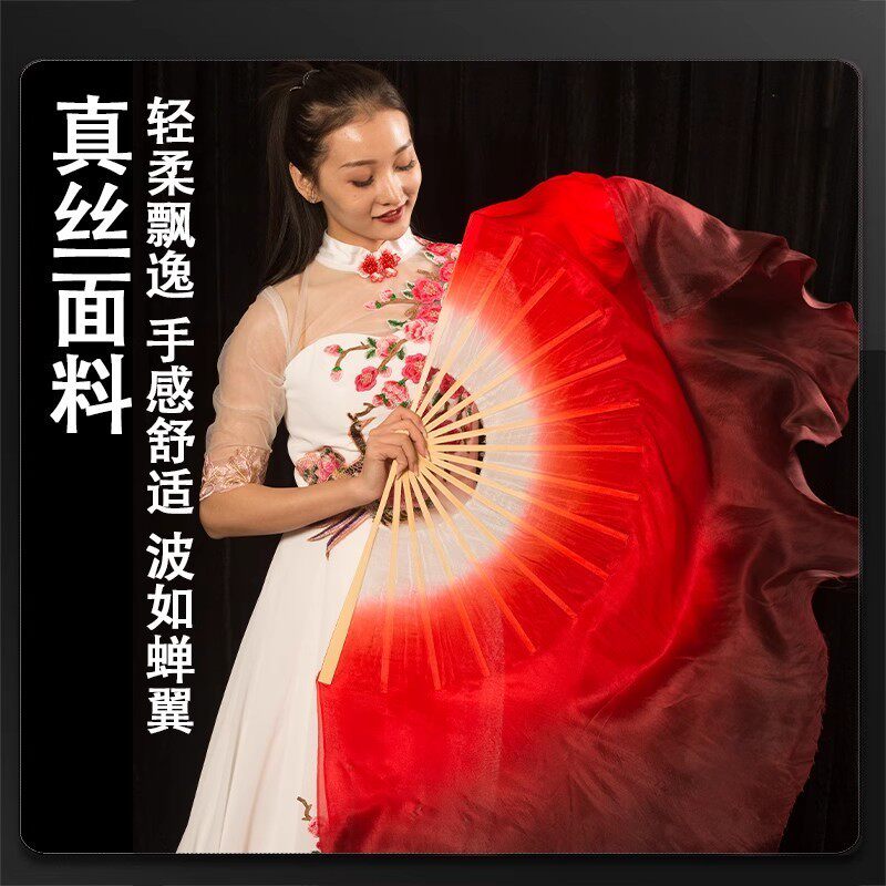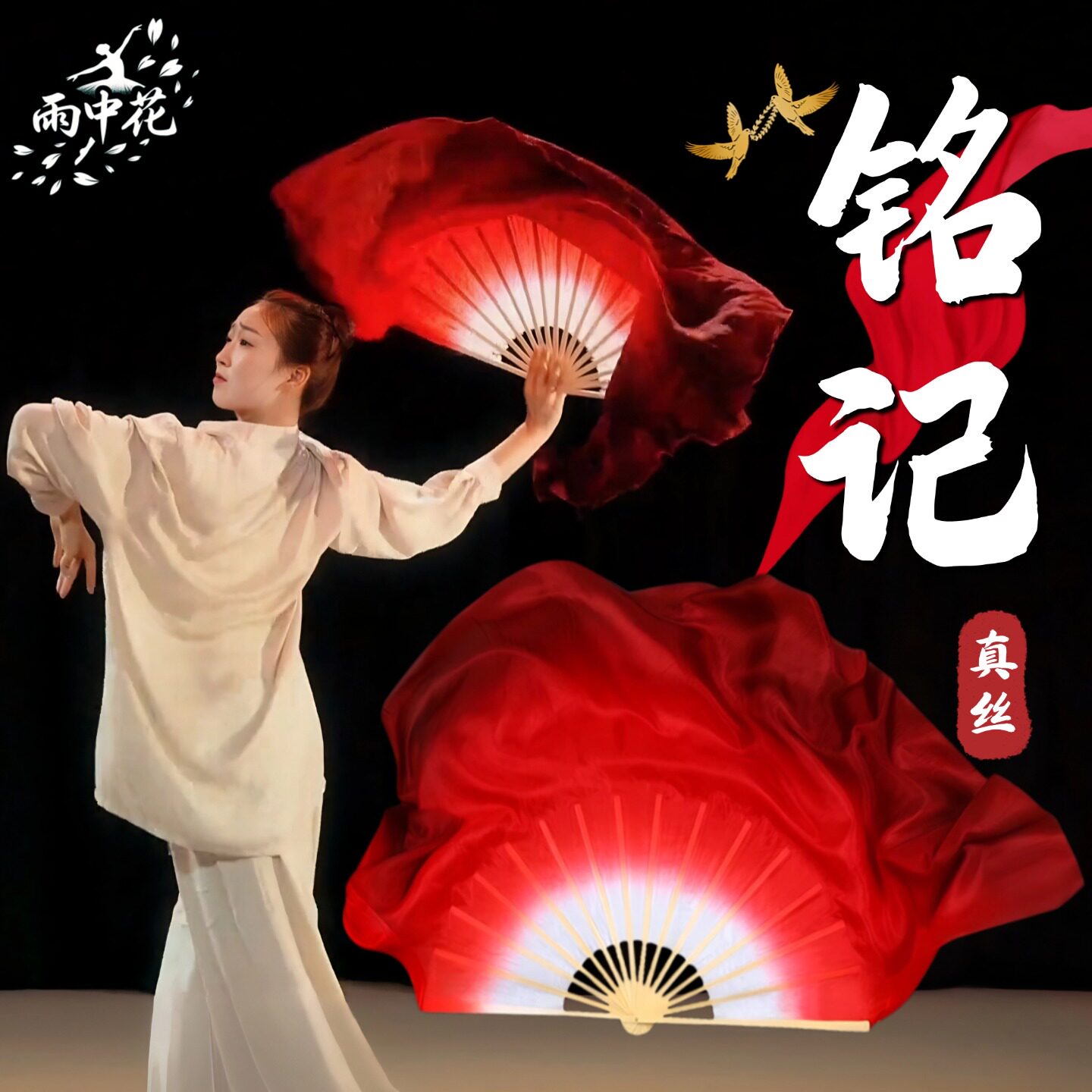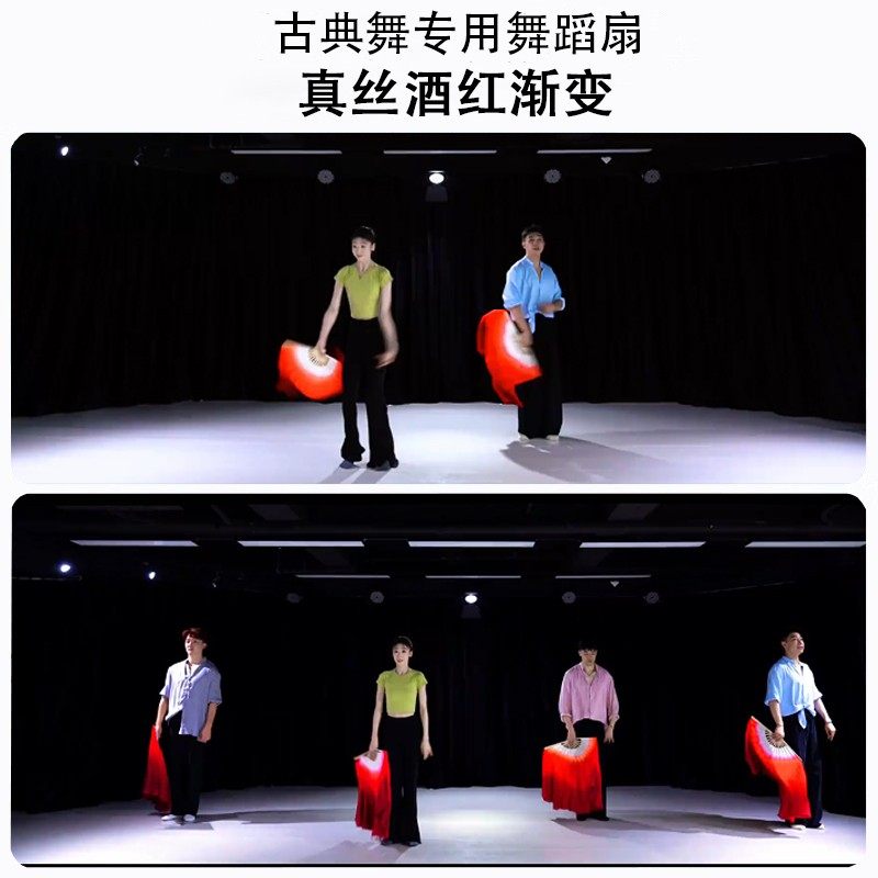 📚 铭记舞蹈扇子真丝双面酒红渐变色秧歌扇古典舞跳舞绸扇表演出道具