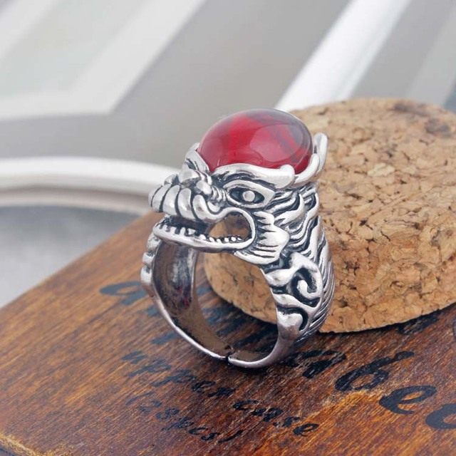 📚 J193夸张戒指 复古 龙头镶红色大钻男士戒指 复古饰品戒指