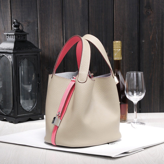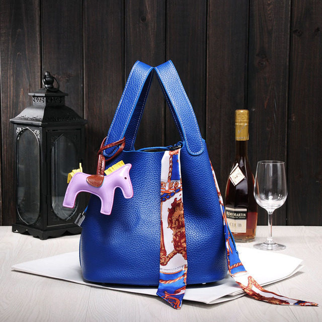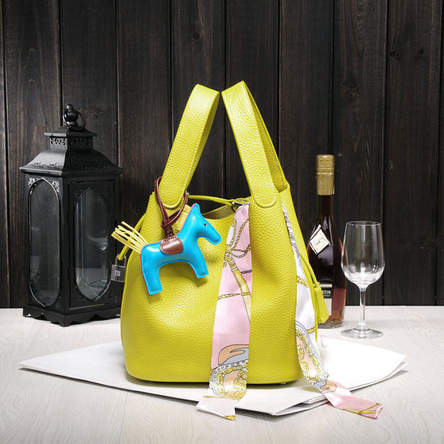 📚 奢侈大牌同款配小马软牛皮真皮百搭水桶女包荔枝纹手拎手提菜蓝包