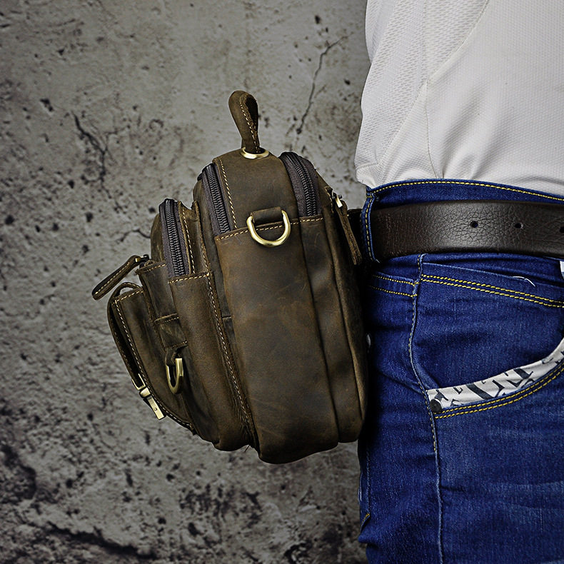 📚 疯马皮头层牛皮男士户外相机包单肩斜跨真皮腰包多功能手提包男包