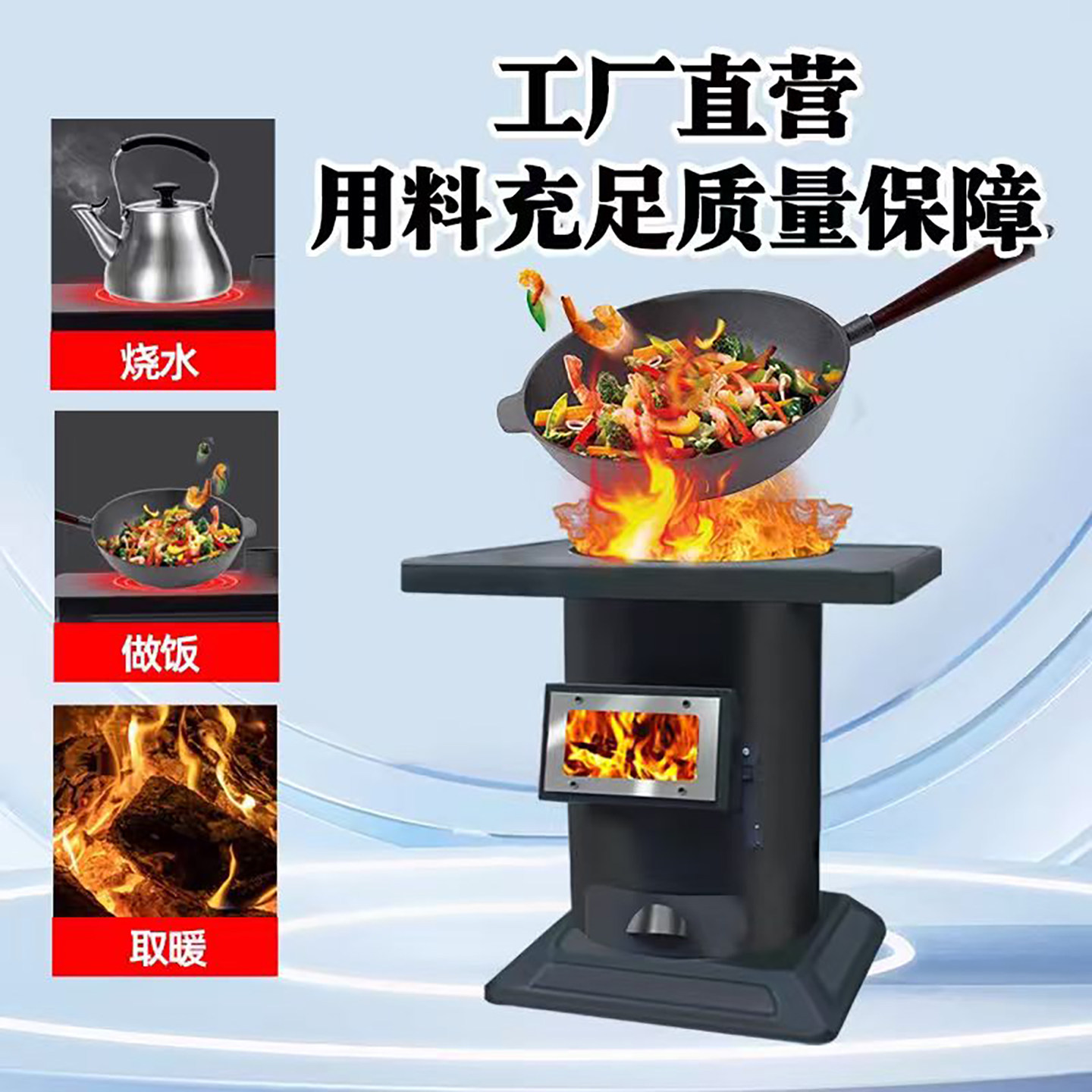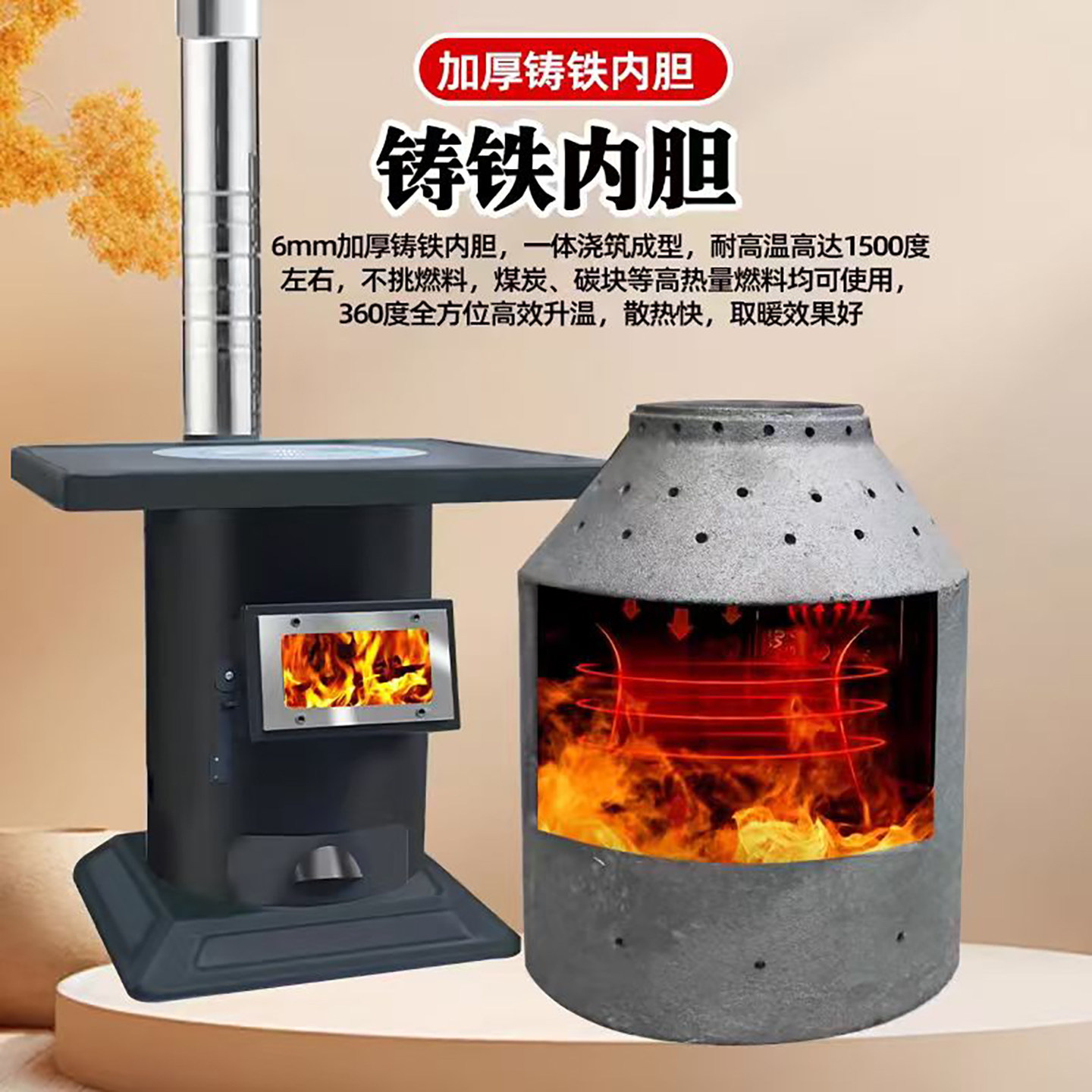 📚 农村小院柴火取暖炉家用室内无烟气化柴煤两用铸铁室内烧柴烤火炉