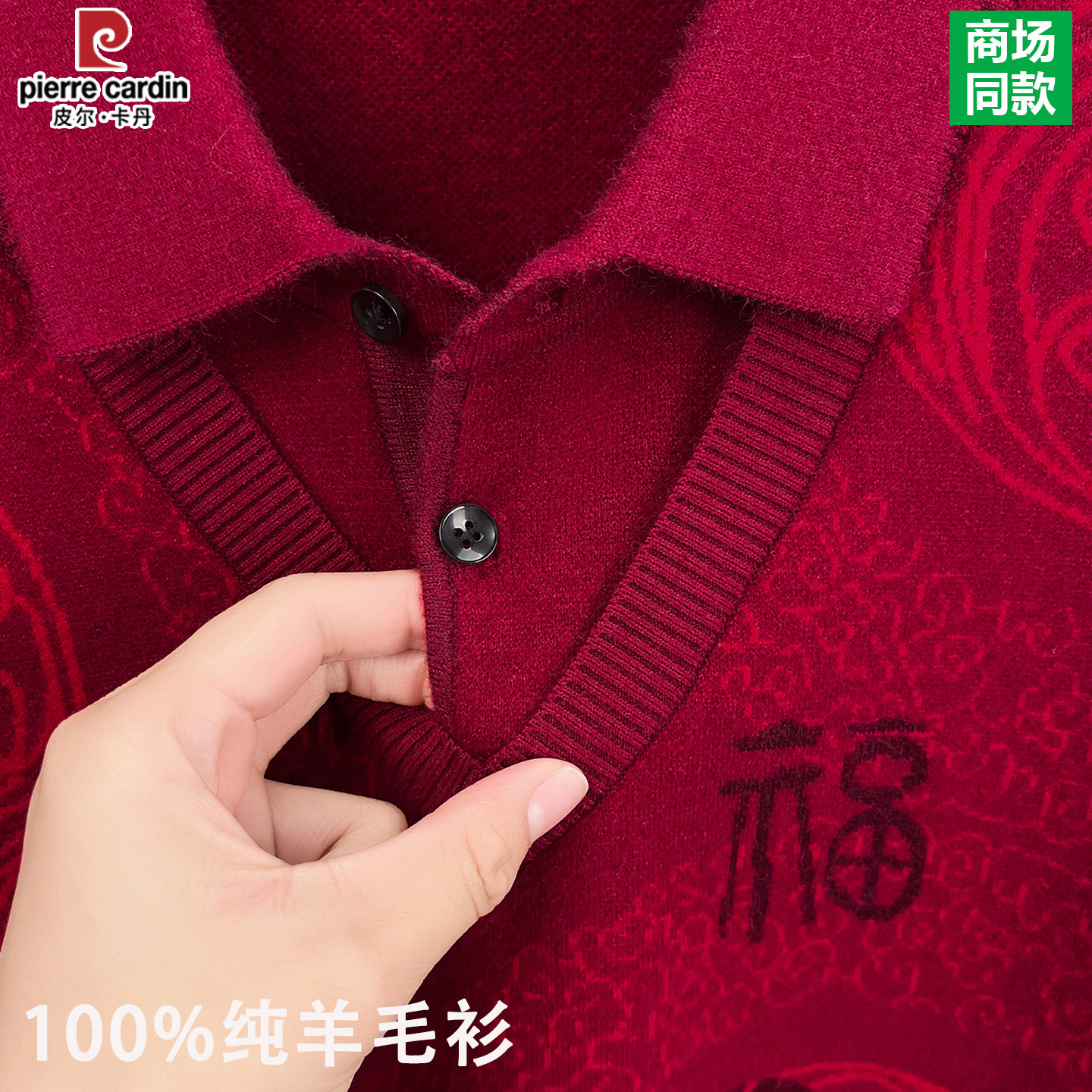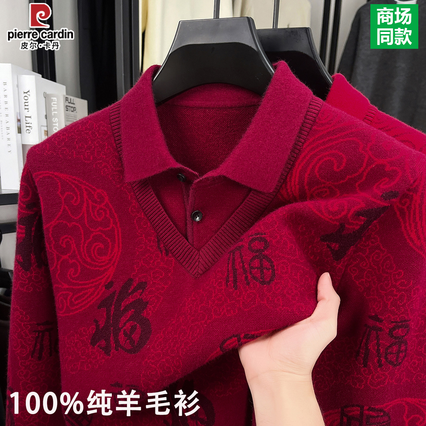 📚 皮尔卡丹纯羊毛衫冬季男士红色假两件加厚毛衣爸爸装本命年打底衫