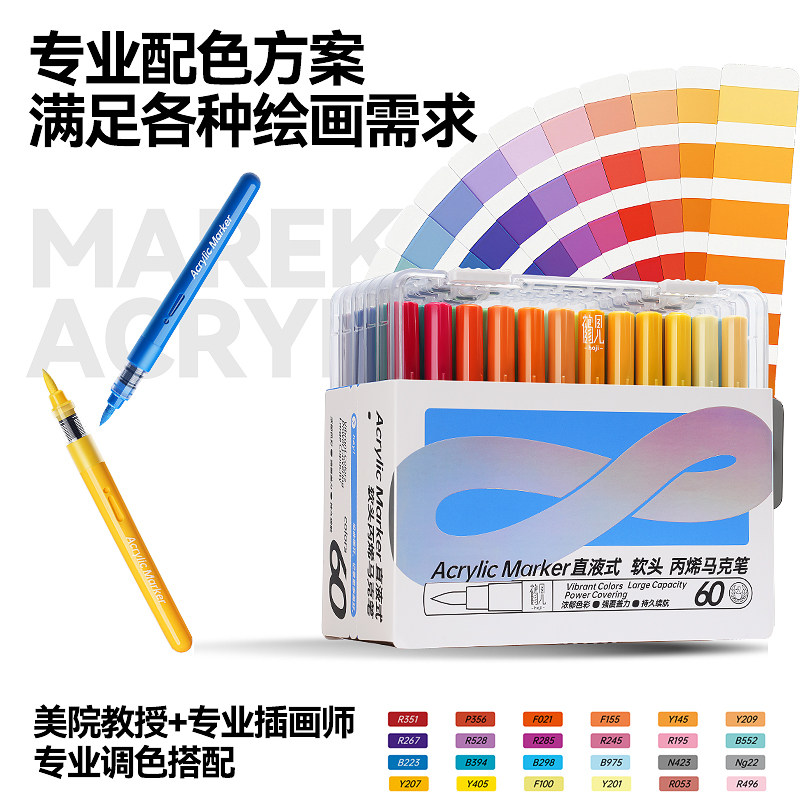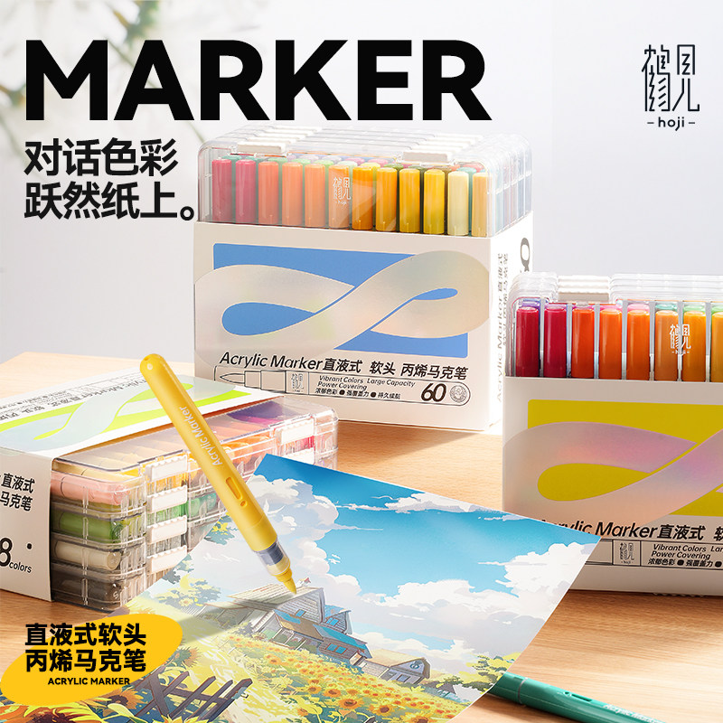 📚 鹤见直液式丙烯马克笔软头笔芯彩色小学生美术生专用24色画笔36色48色幼儿园画画60颜色儿童水彩笔hoji