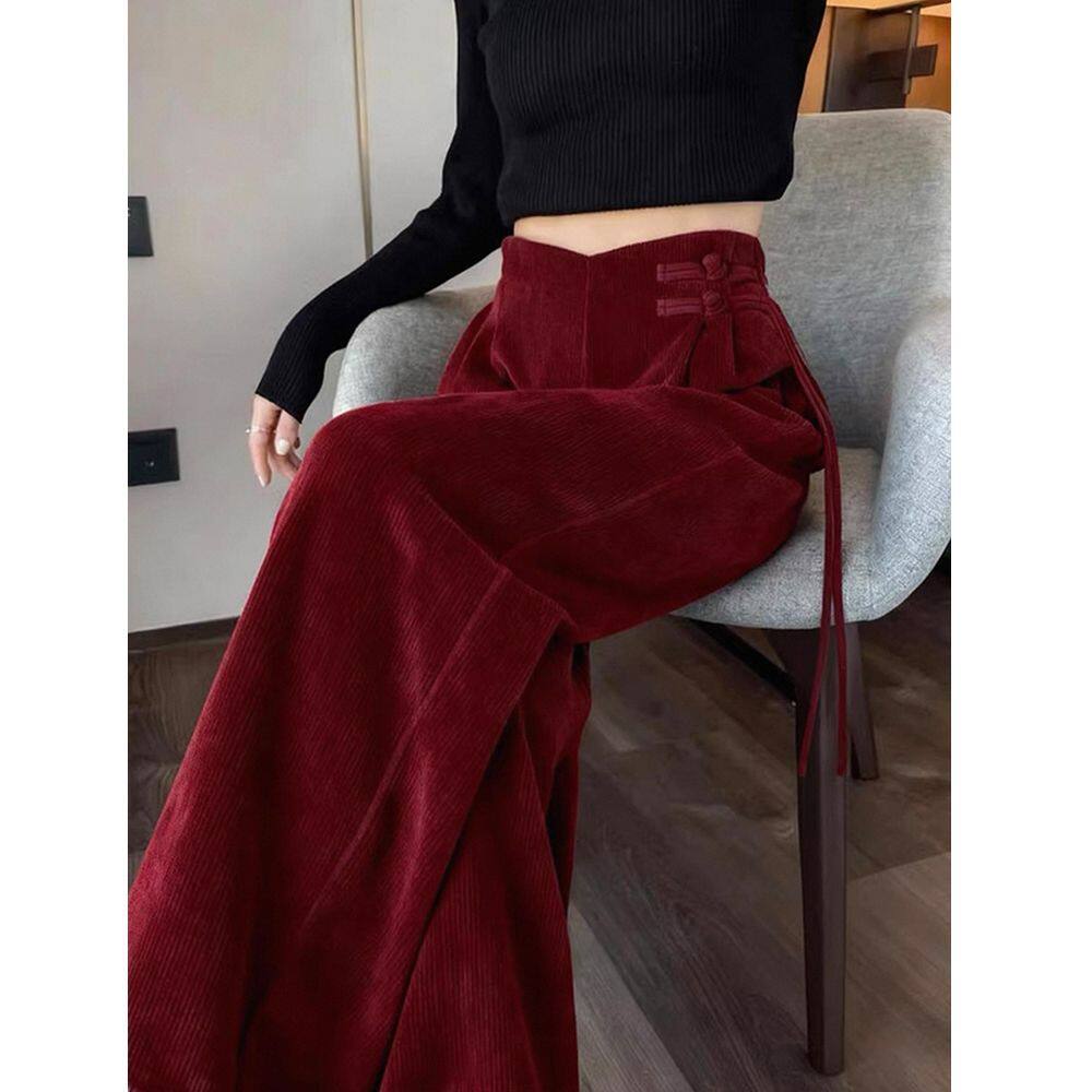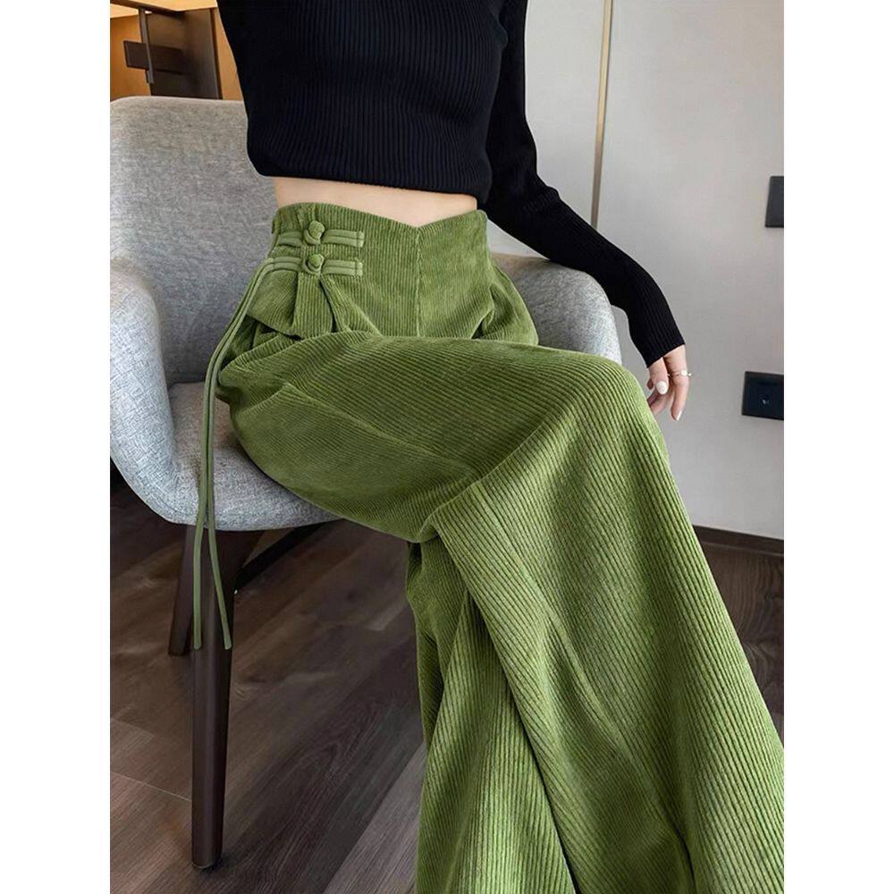 📚 新中式国风橄榄绿色灯芯绒流苏盘扣阔腿裤冬季宽松慵懒风保暖裤子