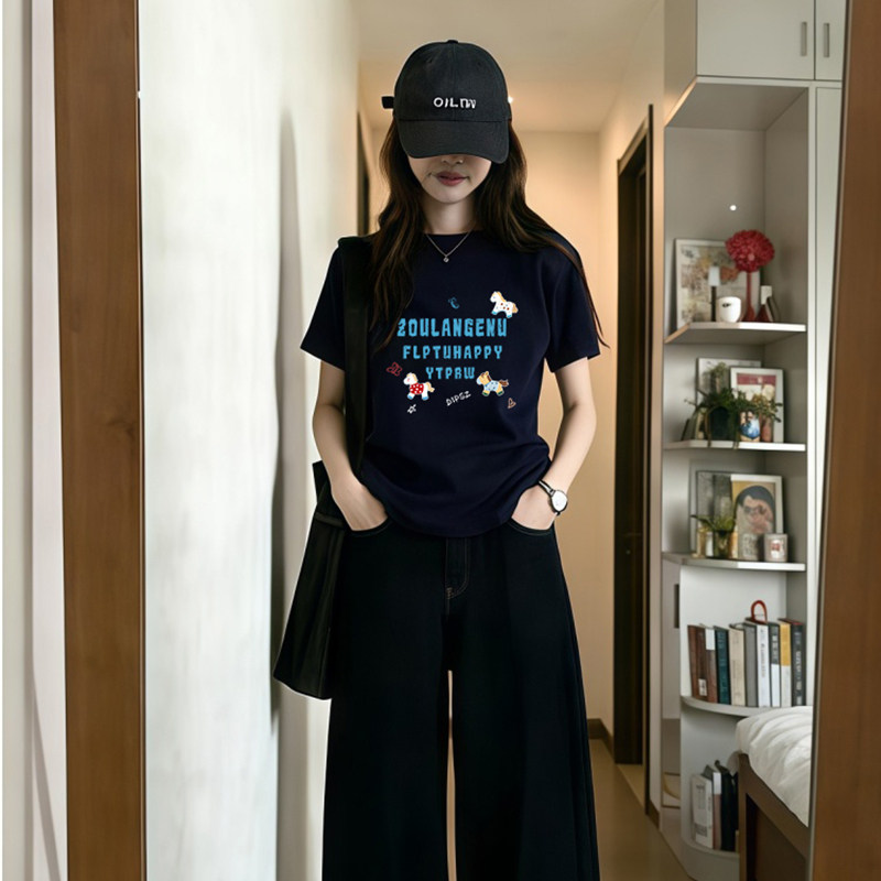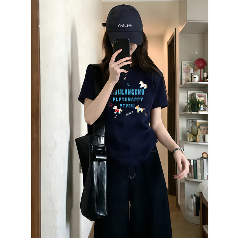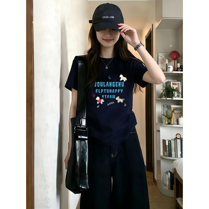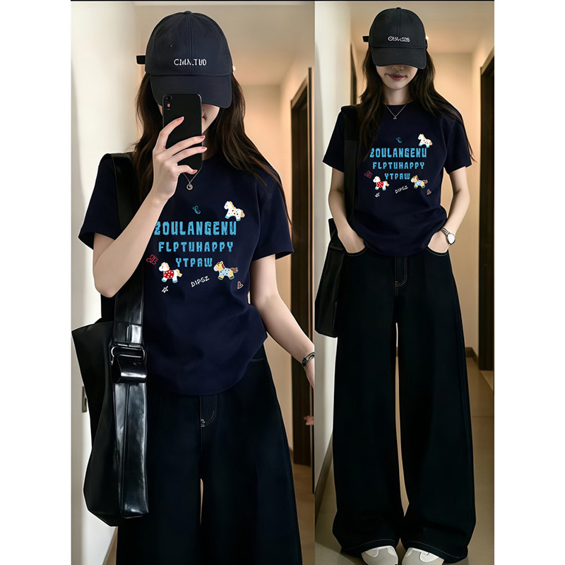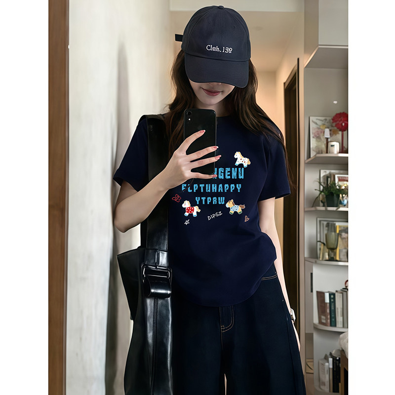 📚 春夏新款小马印花正肩短袖t恤女修身高弹力棉圆领大码女装上衣ins