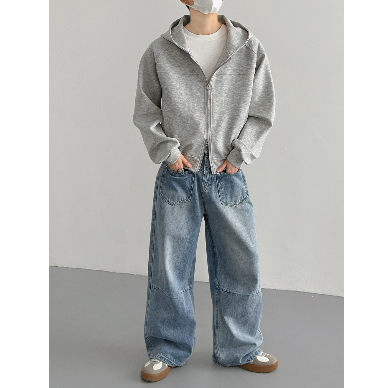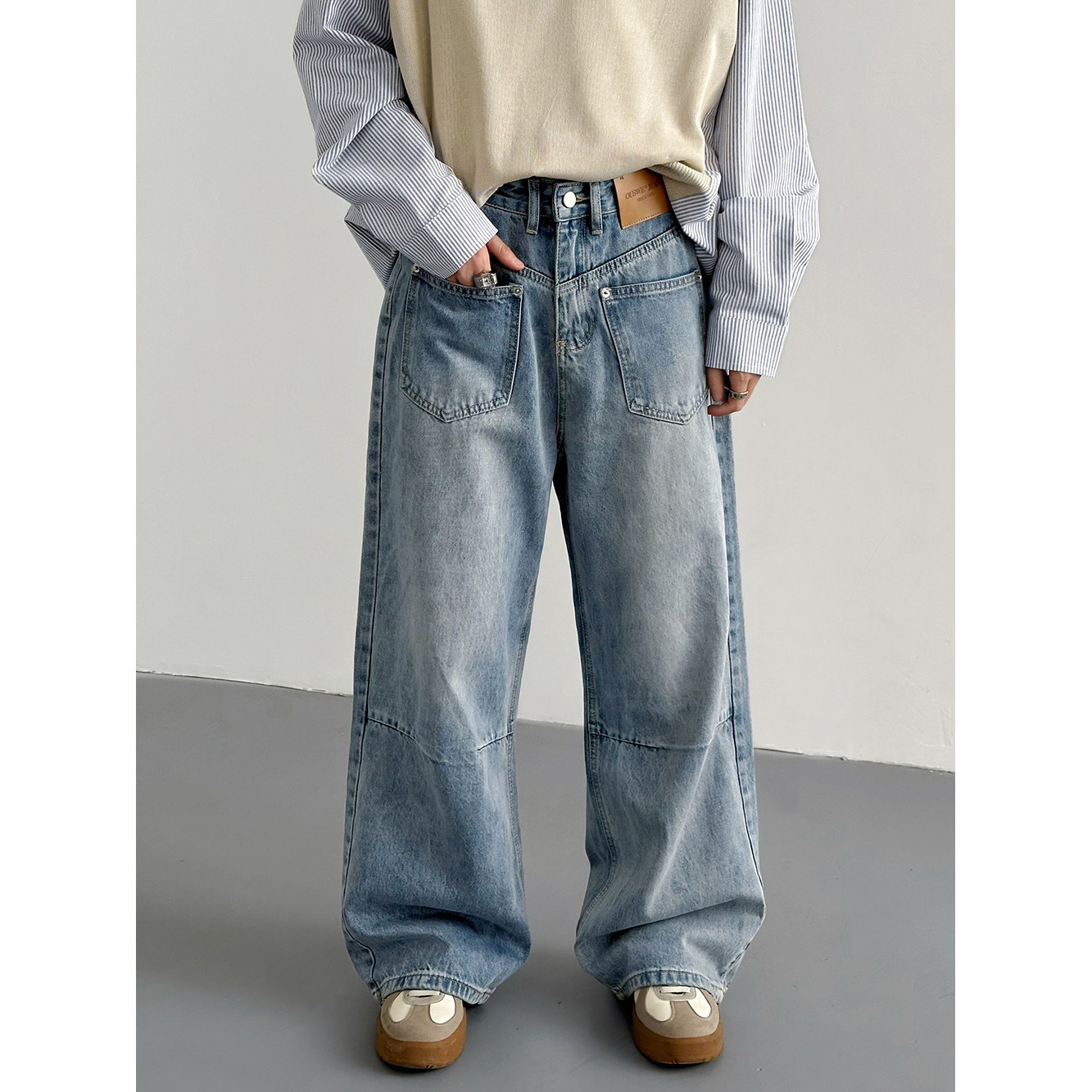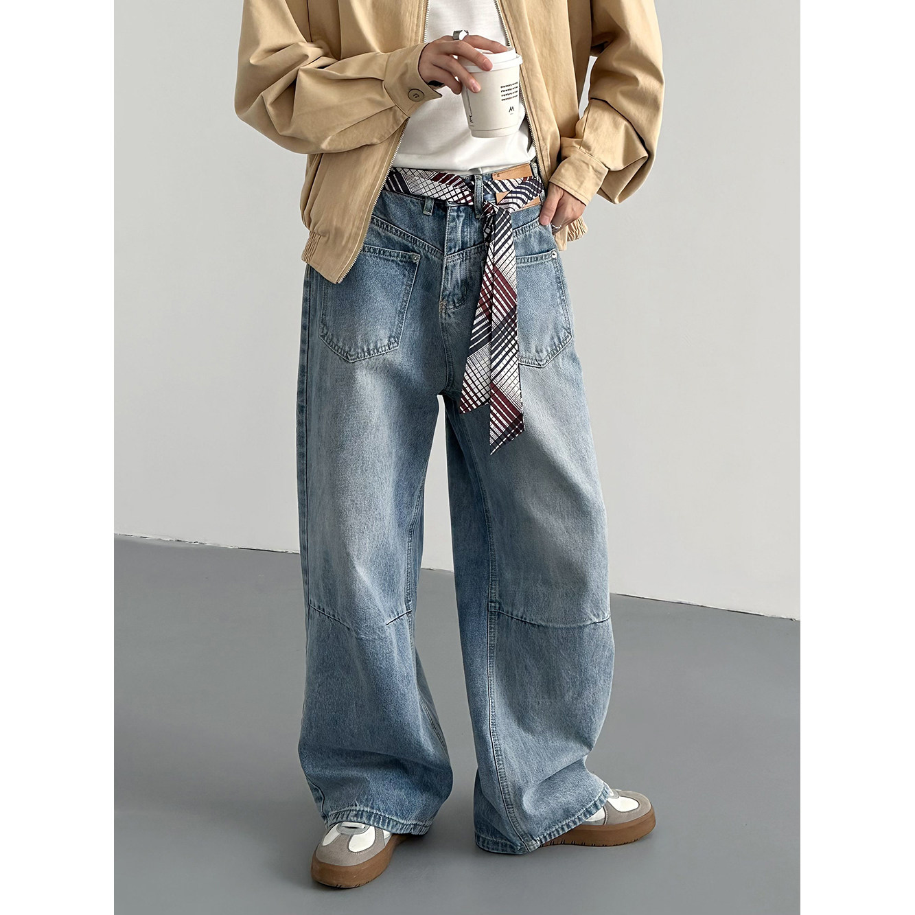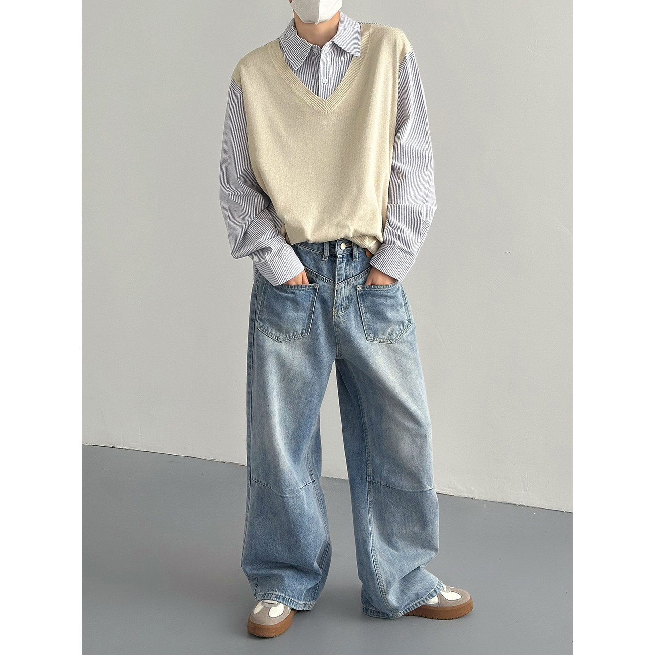 📚 春秋韩版时髦复古设计师款平口袋蓝色牛仔裤男士宽松阔腿拖地裤