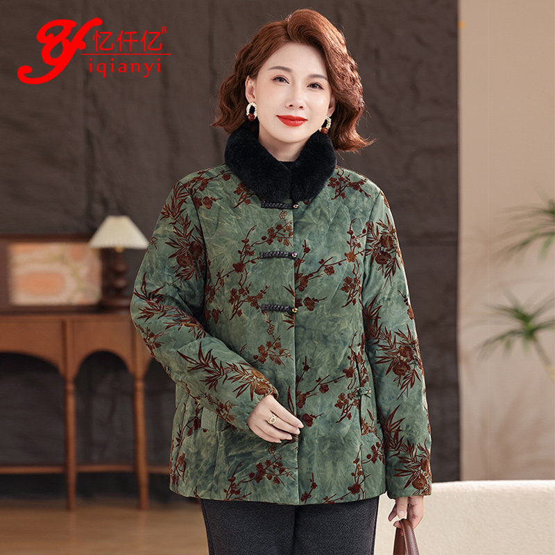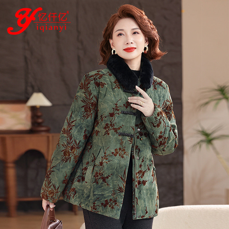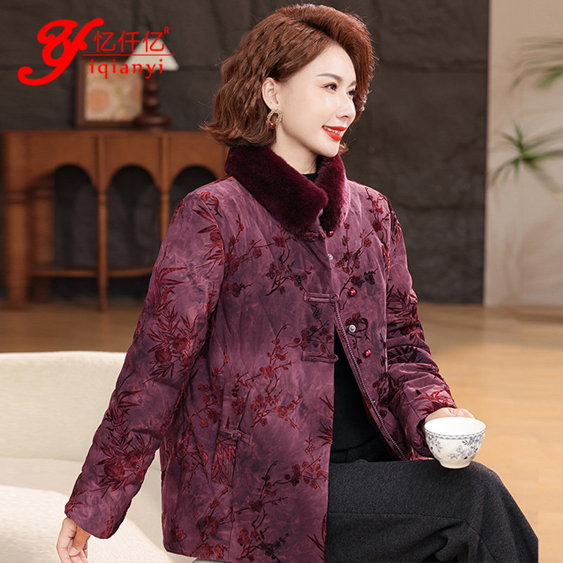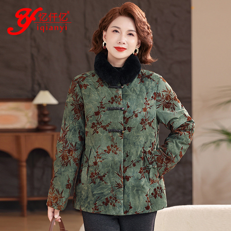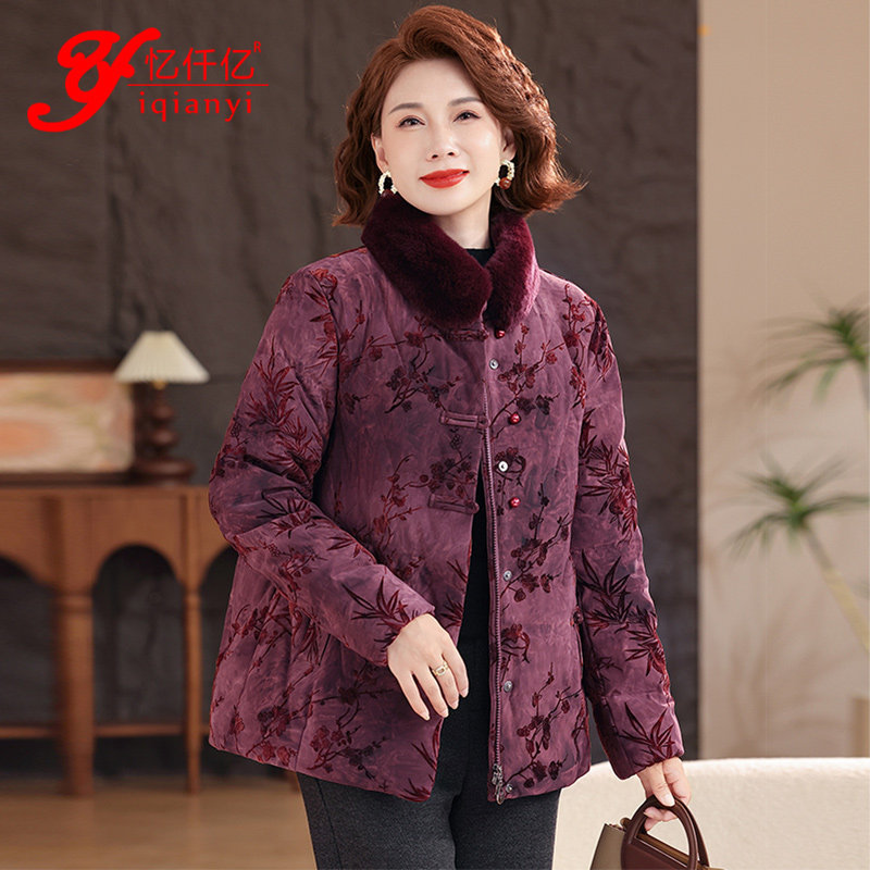 📚 高端中老年女人羽绒服水貂毛国风妈妈装衣服中式印花时尚保暖外套