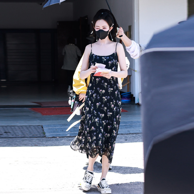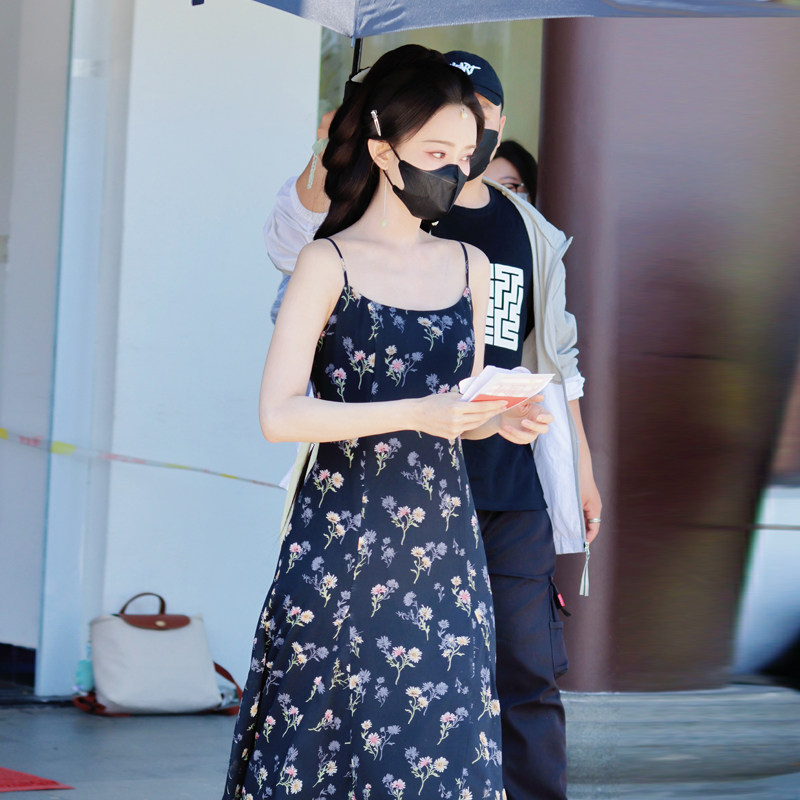 📚 孟子义明星同款黑色碎花吊带连衣裙女气质印花中长裙收腰雪纺裙夏