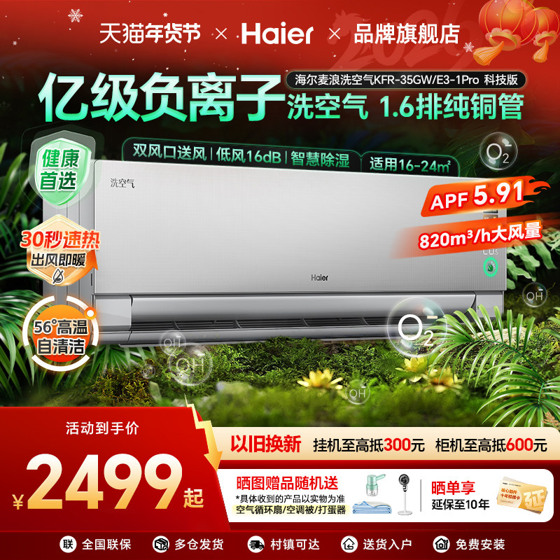 📚 海尔空调洗空气Pro纯铜管1.5匹挂机官方家用省电新一级能耗35E3-1