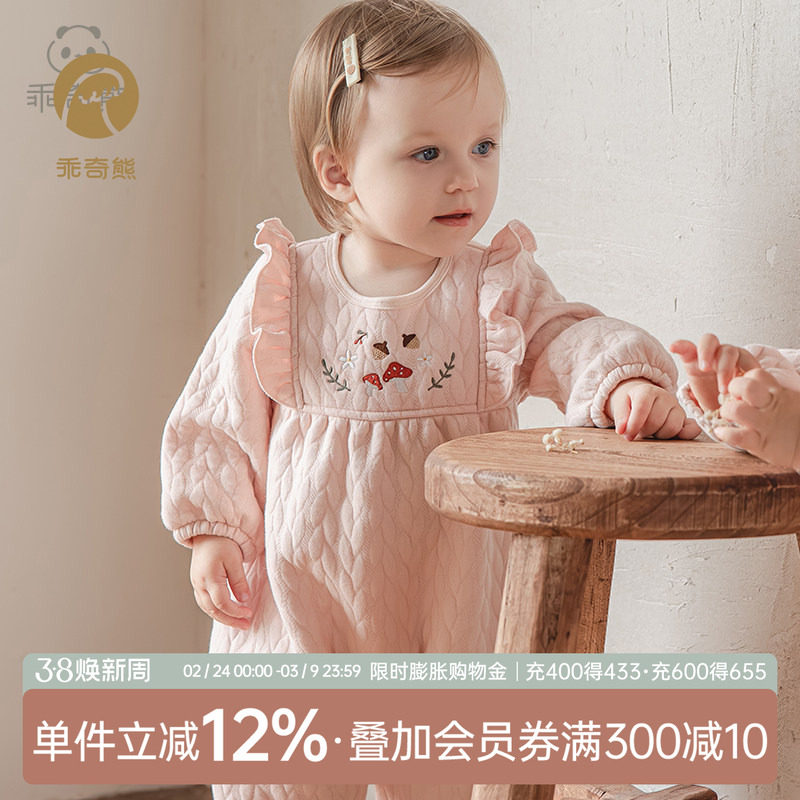 📚 乖奇熊女宝宝夹丝棉连体衣秋冬季保暖婴幼儿可爱公主风哈衣爬爬服