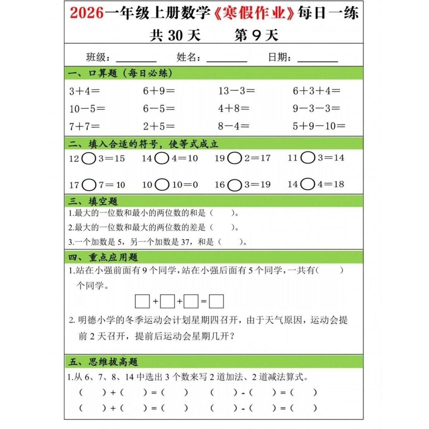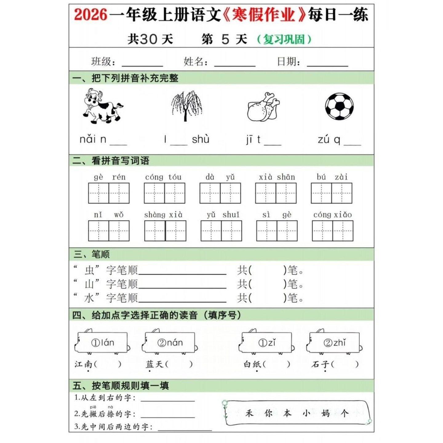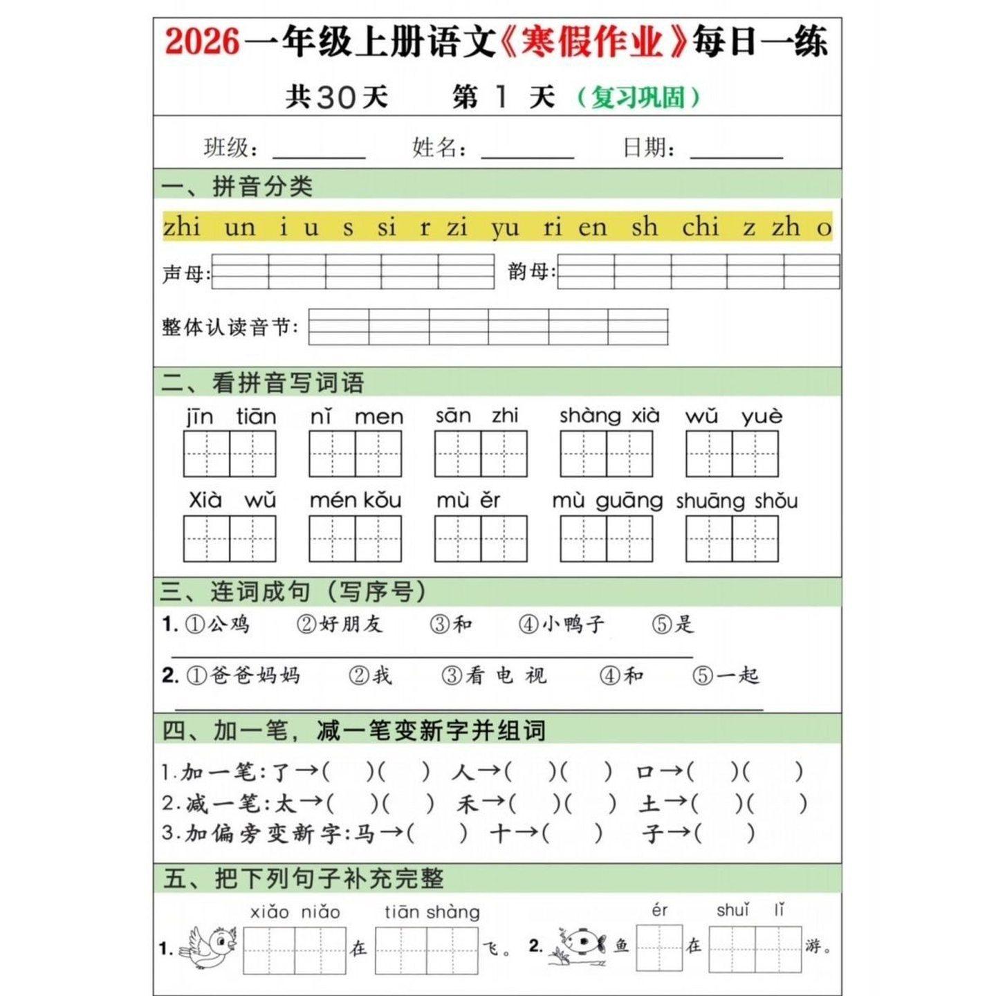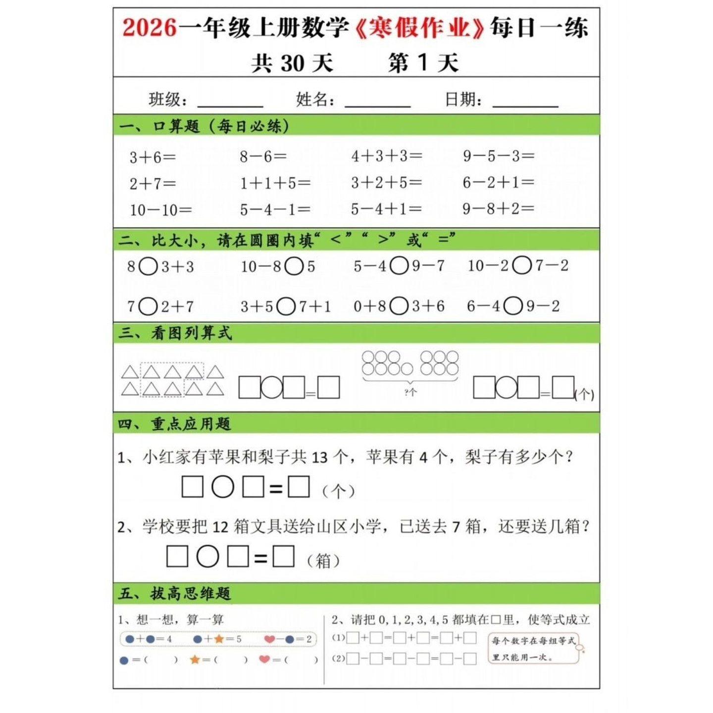 📚 新一年级上册数学寒假作业语文假期作业每日一练期末复习下册预习