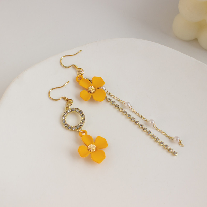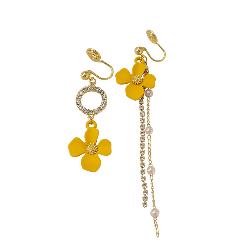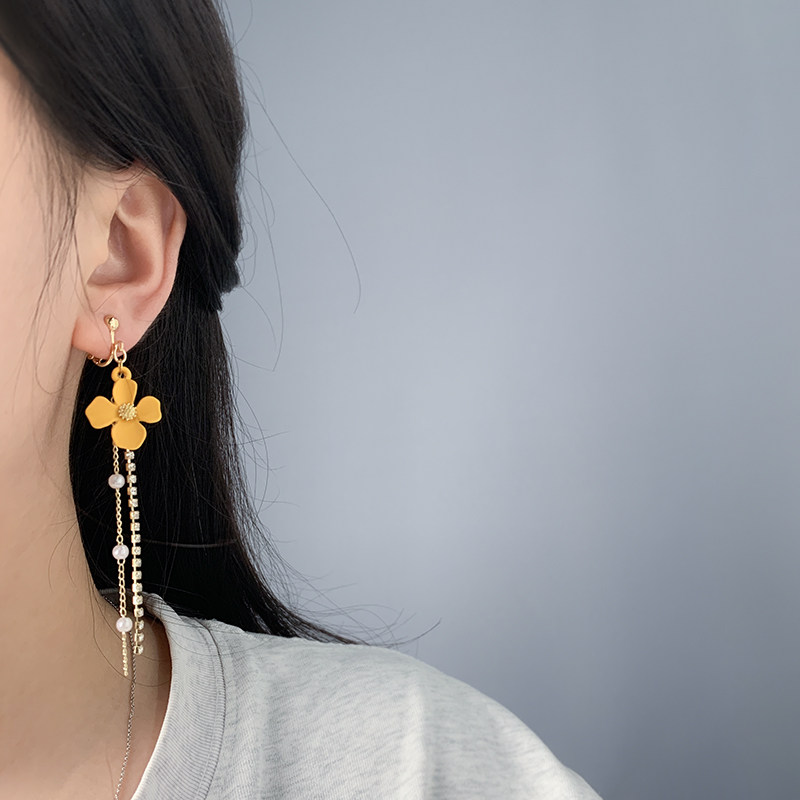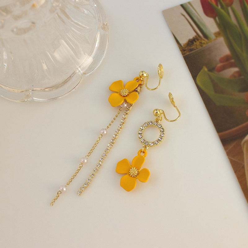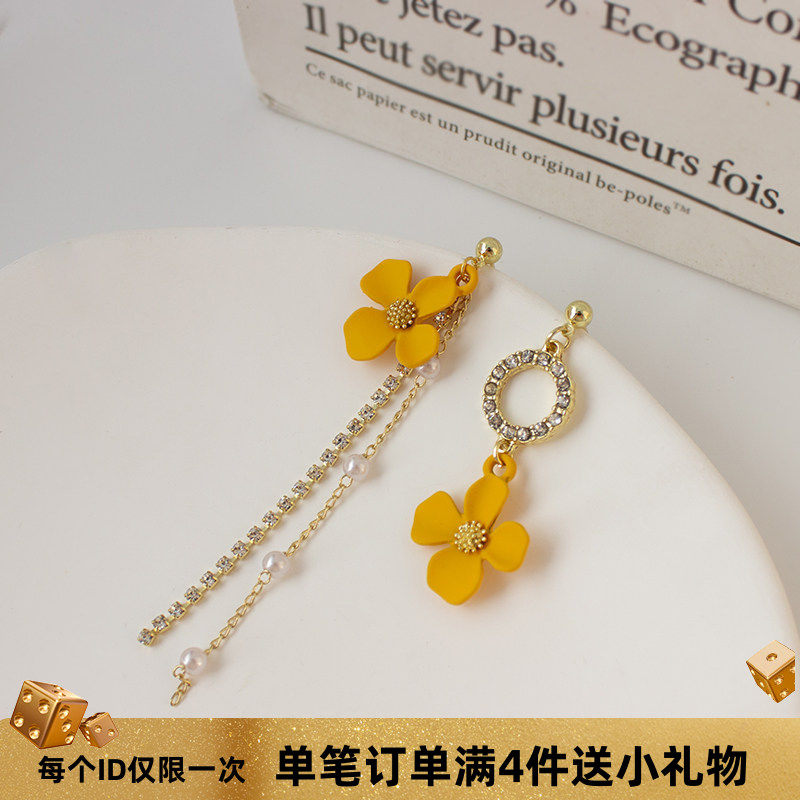 📚 法式温柔黄色花朵耳环甜美茶系耳钉不对称流苏气质耳坠无耳洞耳夹