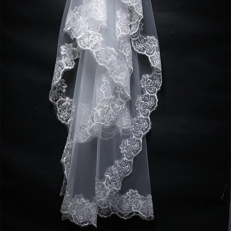 📚 简约气质头纱香槟色白色红色新娘头饰蕾丝花边新款长拖尾结婚拍照