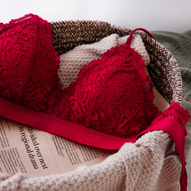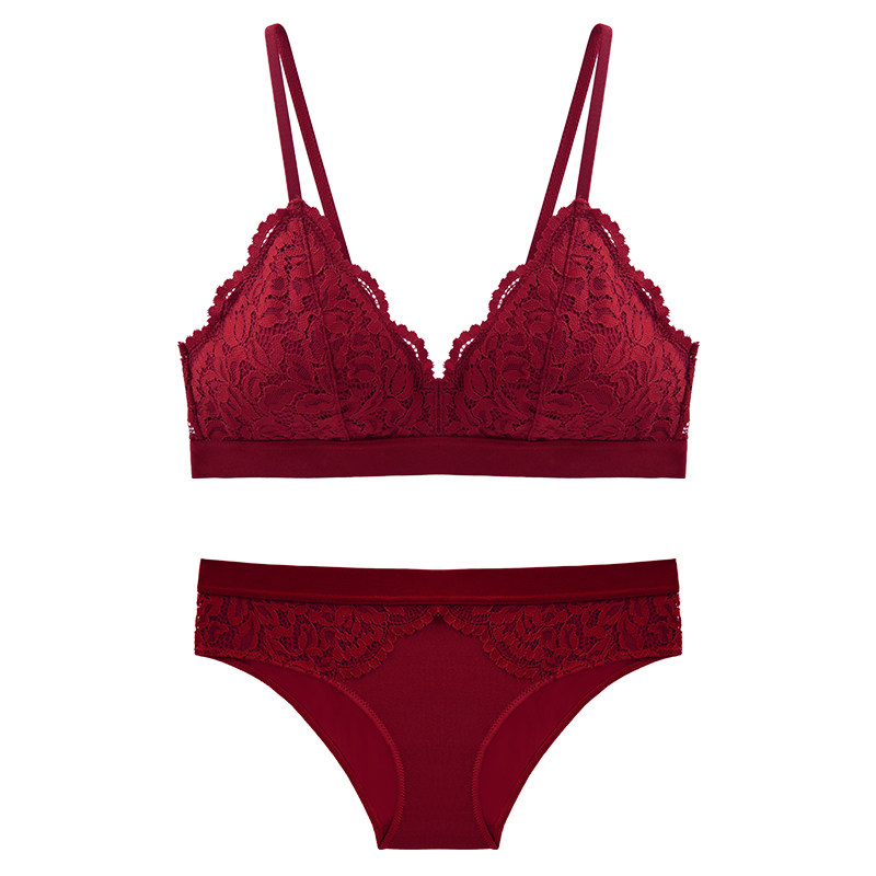 📚 性感蕾丝法式三角杯文胸套装红色本命年新娘结婚无钢圈小胸内衣女