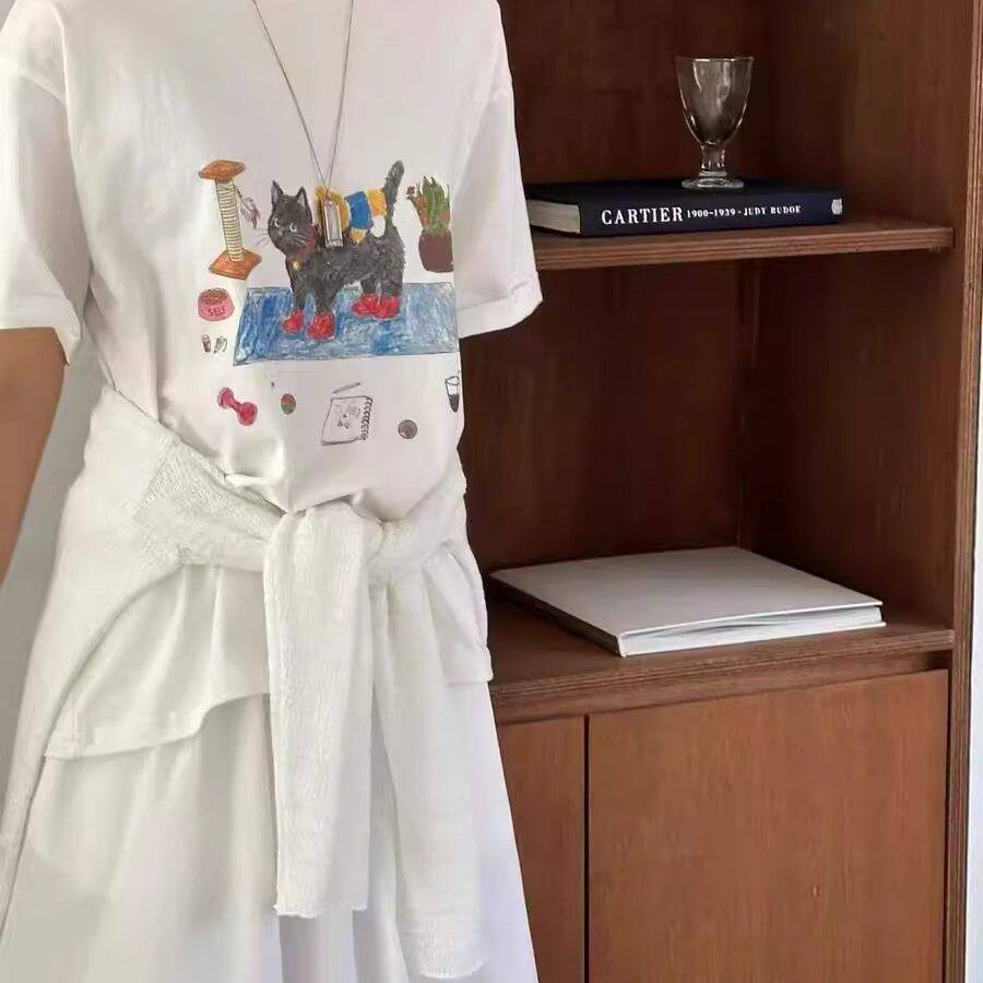 📚 天花板!SELF SERVICE韩国2026春夏款可爱猫咪印花圆领T恤女上衣