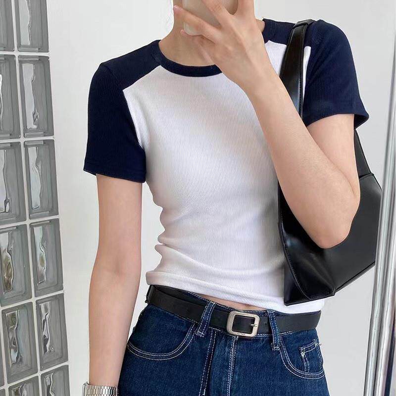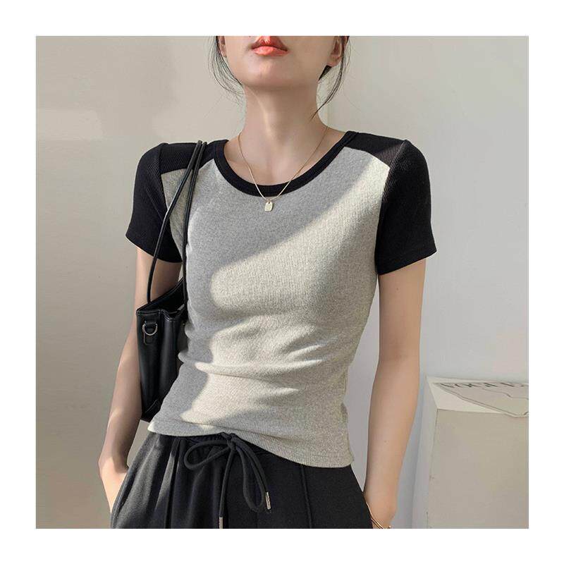 📚 洋气拼接短袖T恤女夏设计感2026新款修身上衣复古螺纹优棉打底衫
