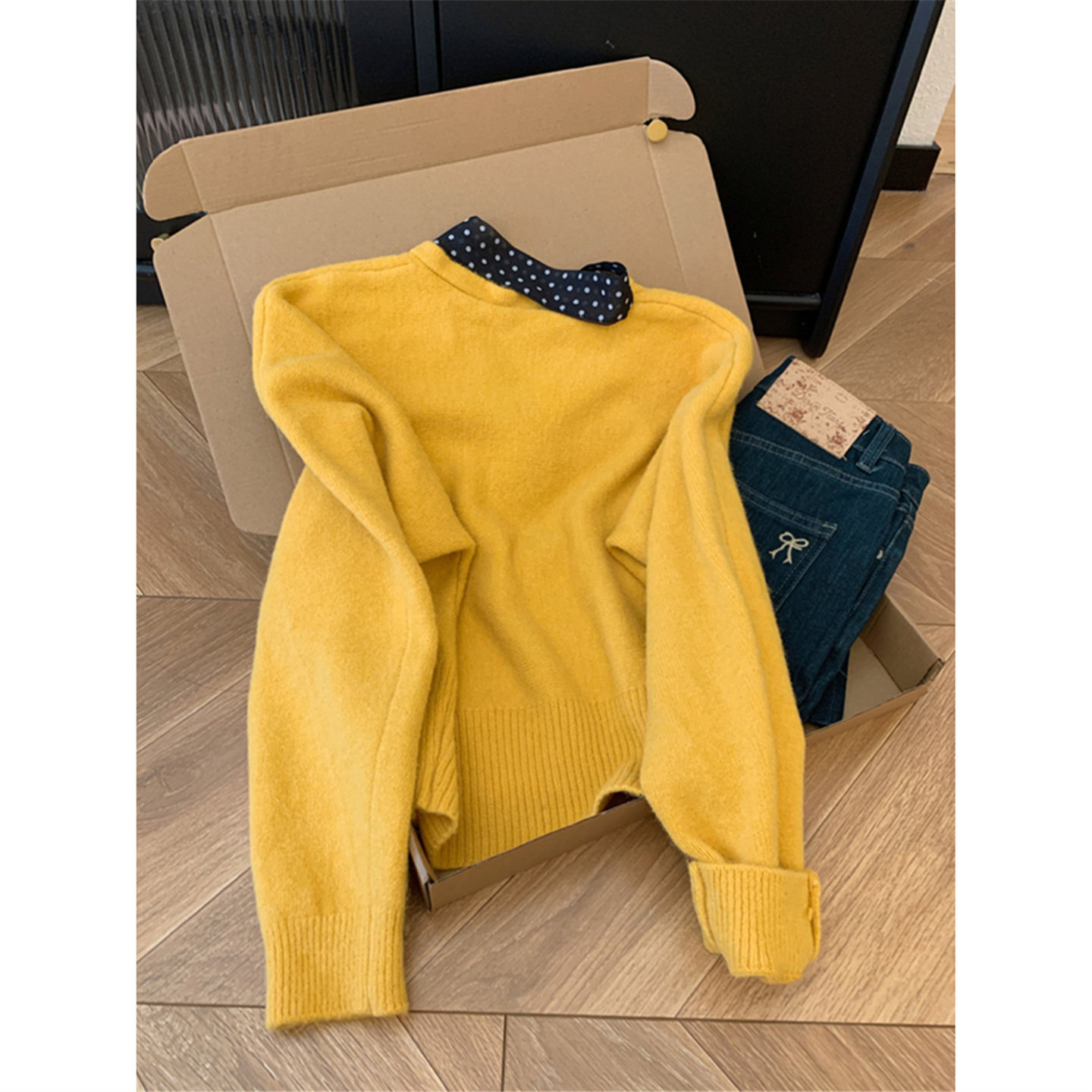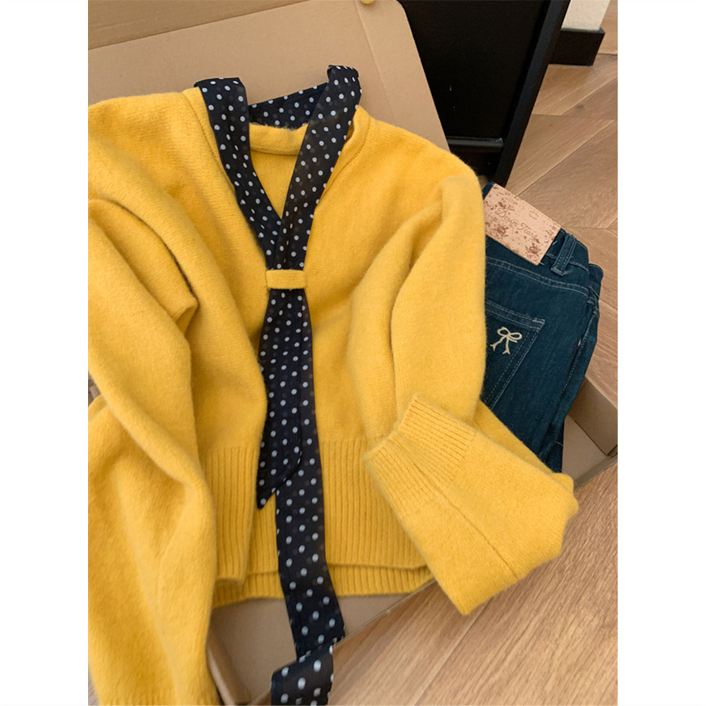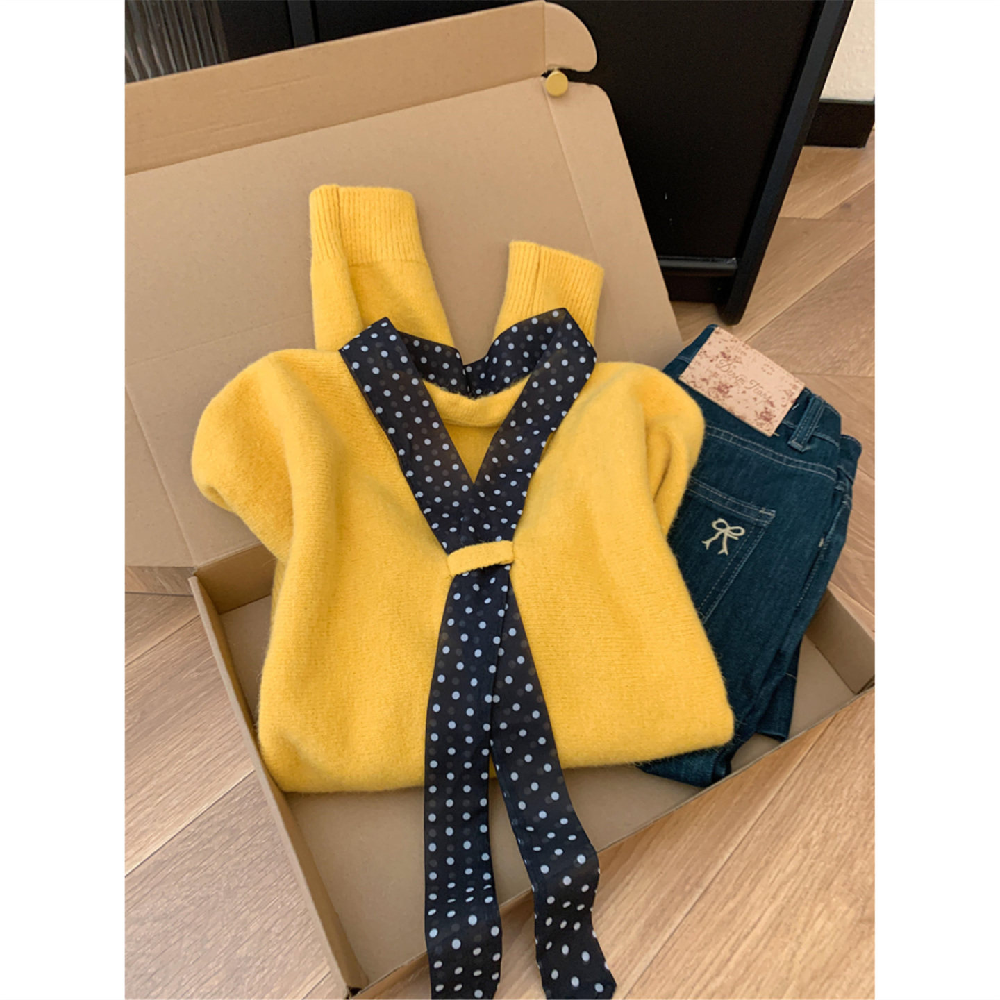 📚 黄色温柔风韩系波点丝巾套头针织衫毛衣女秋冬外穿百搭高级感上衣