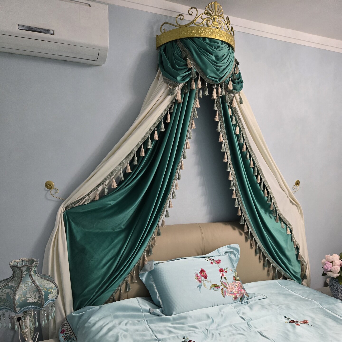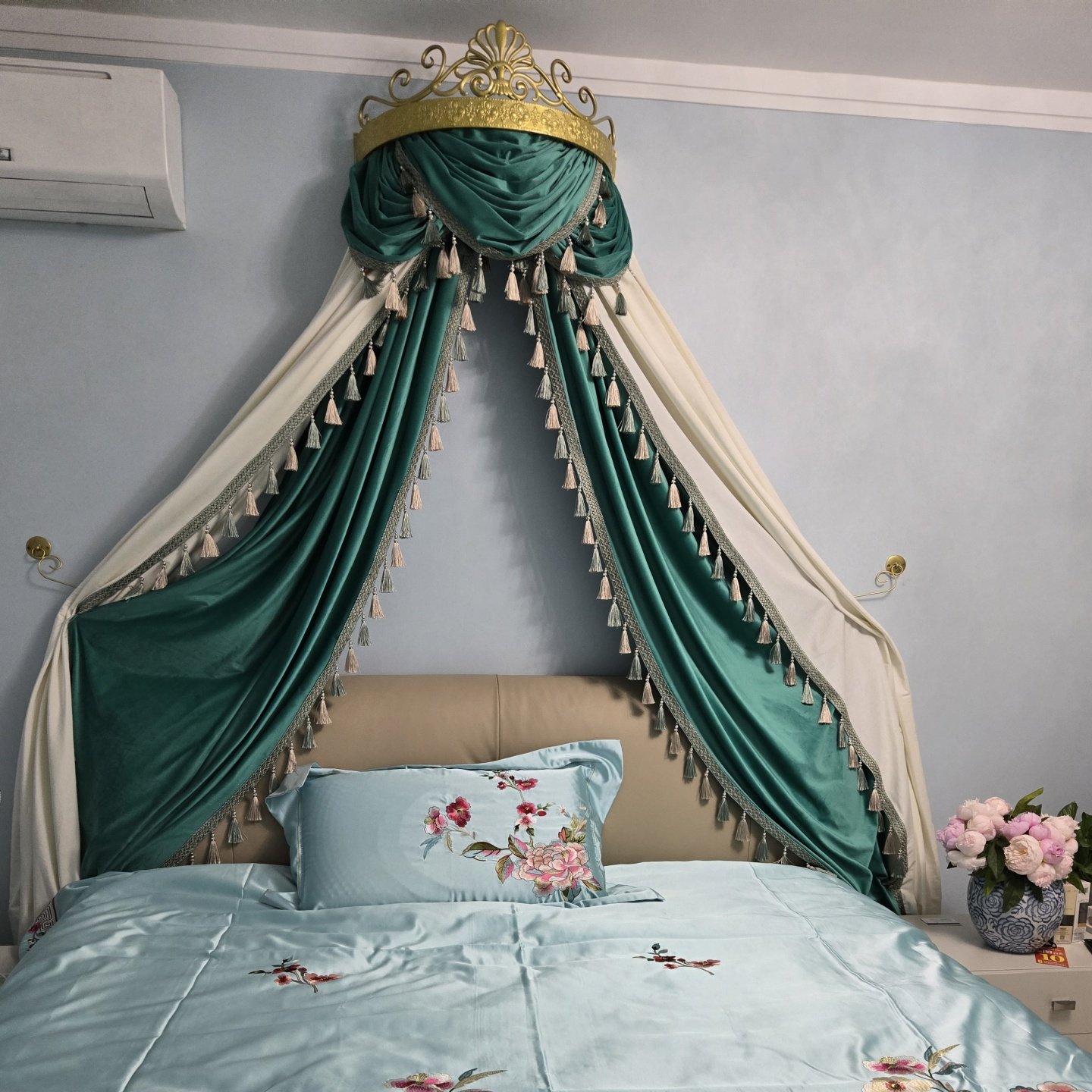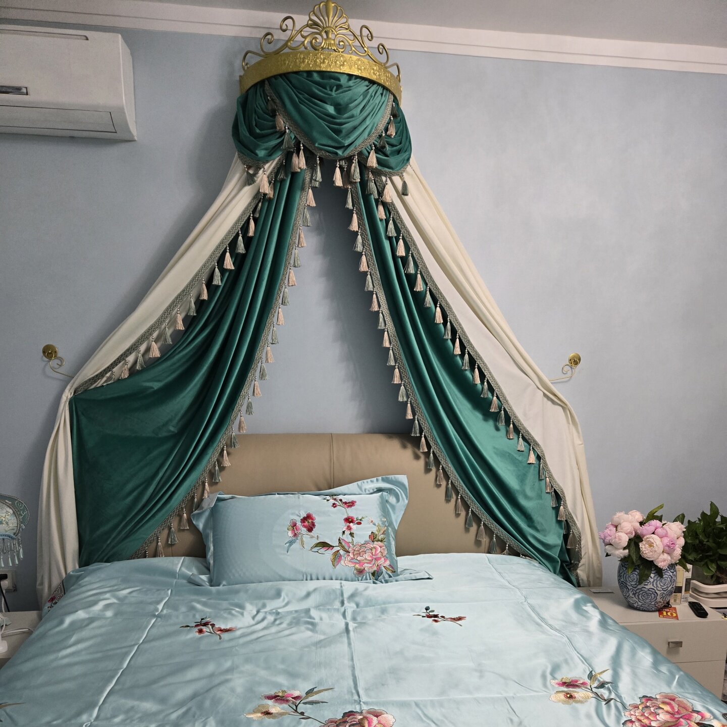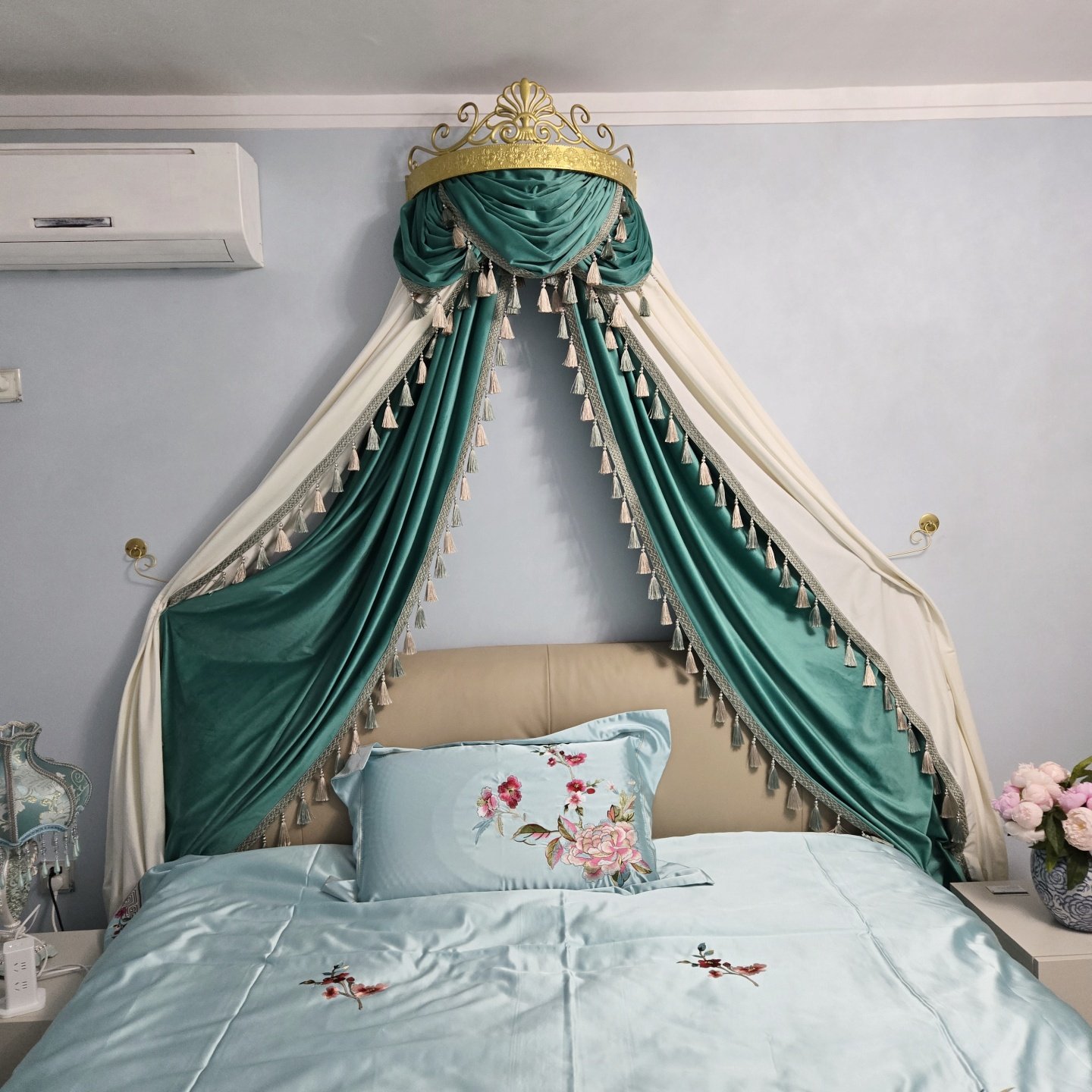 📚 法式风情床幔床帘水波欧式美式绿米双层丝绒公主复古帷幔含皇冠架