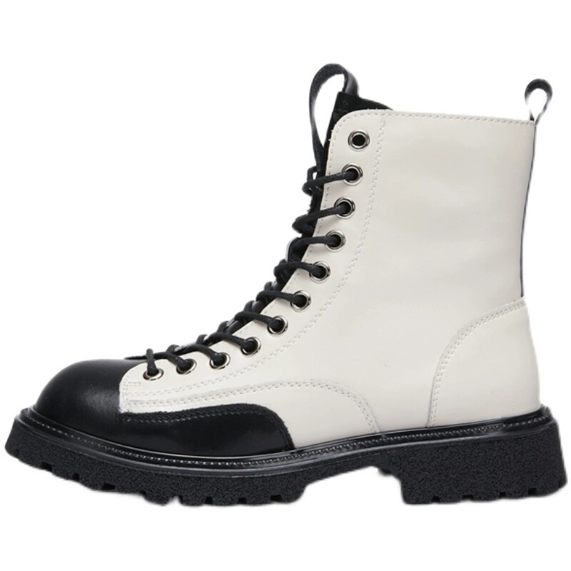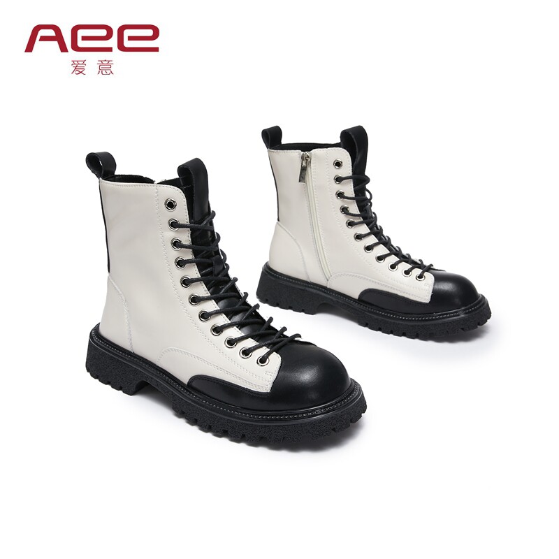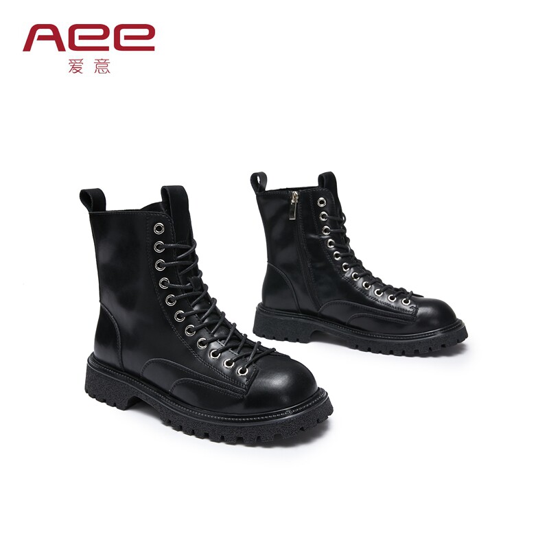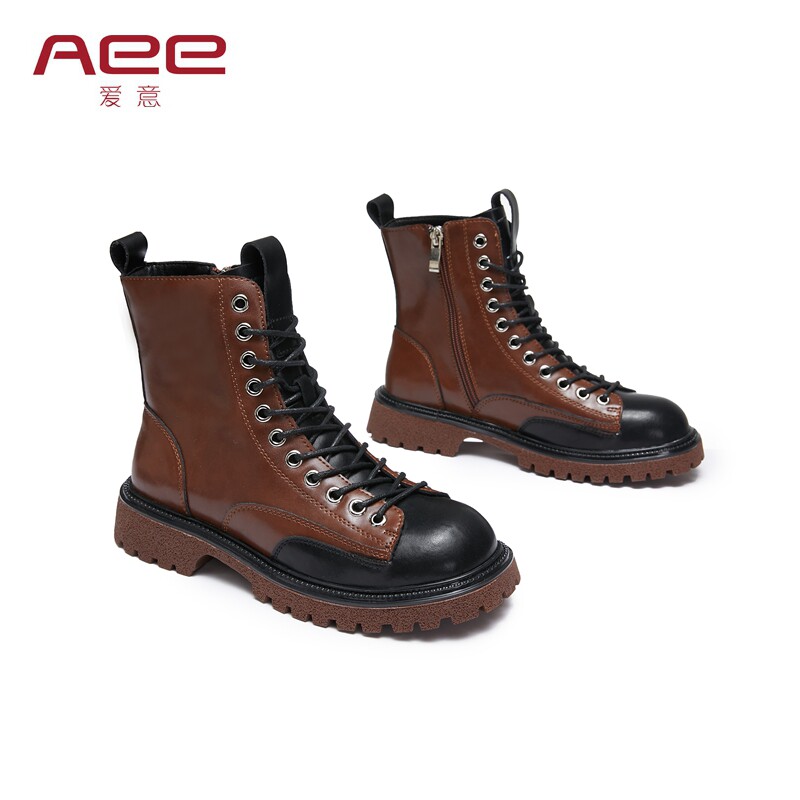 📚 Aee/爱意马丁靴牛皮圆头舒适中跟侧拉链女短靴4121505004