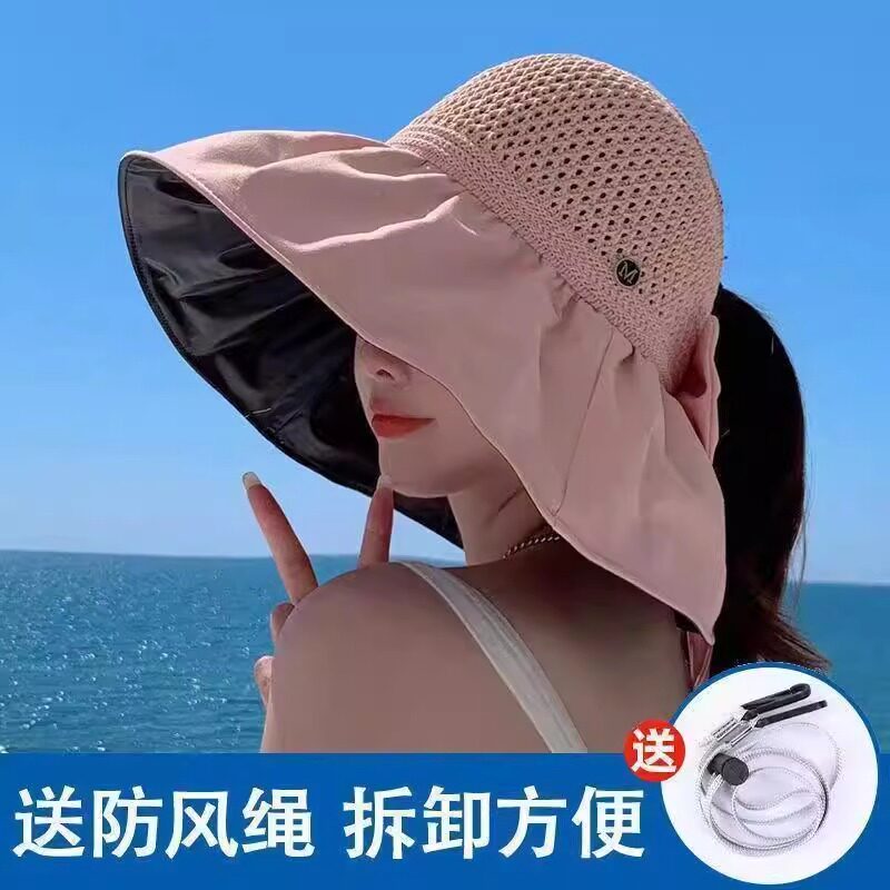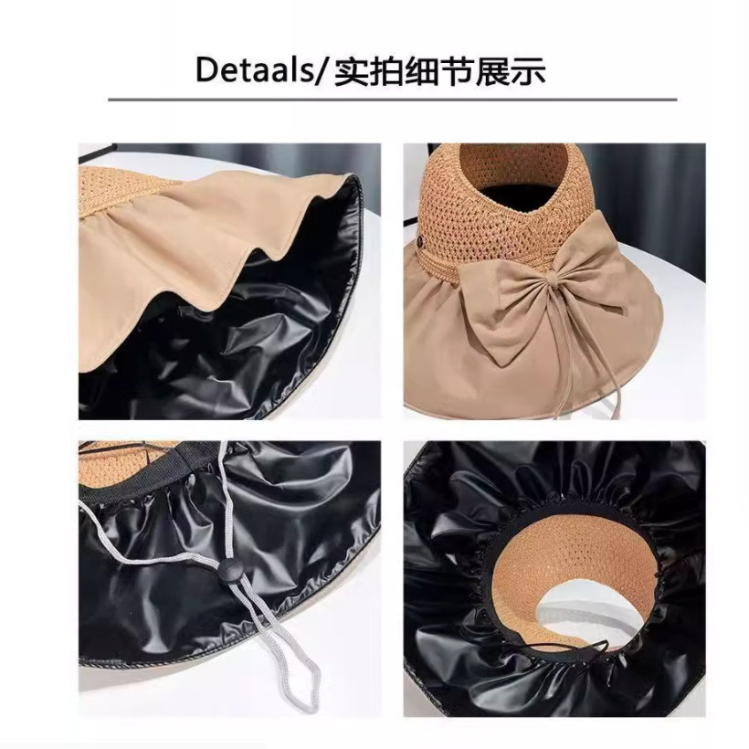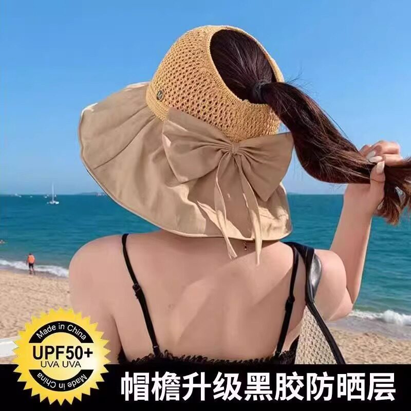 📚 黑胶防晒帽女防紫外线遮阳帽大帽檐渔夫帽夏季可扎马尾空顶太阳帽