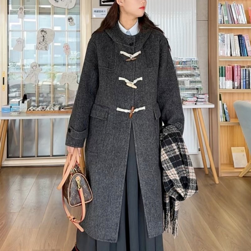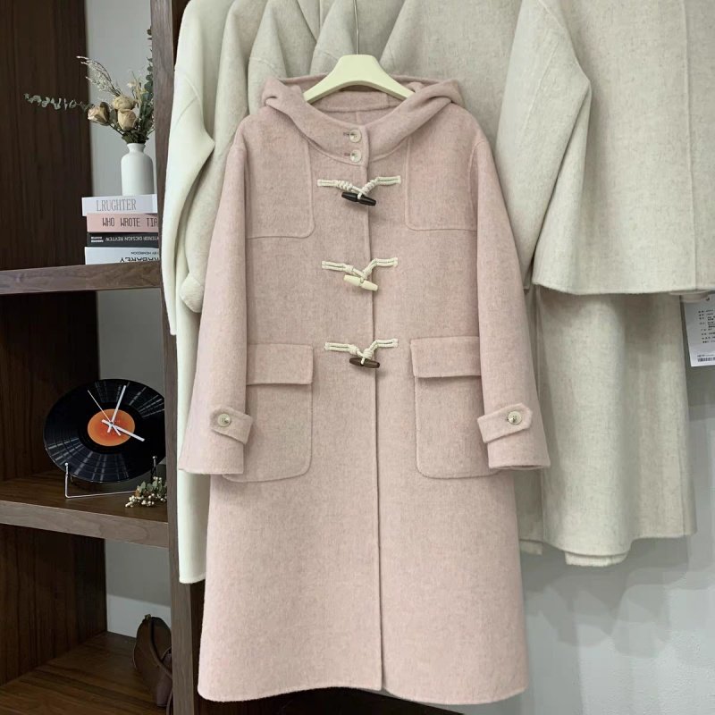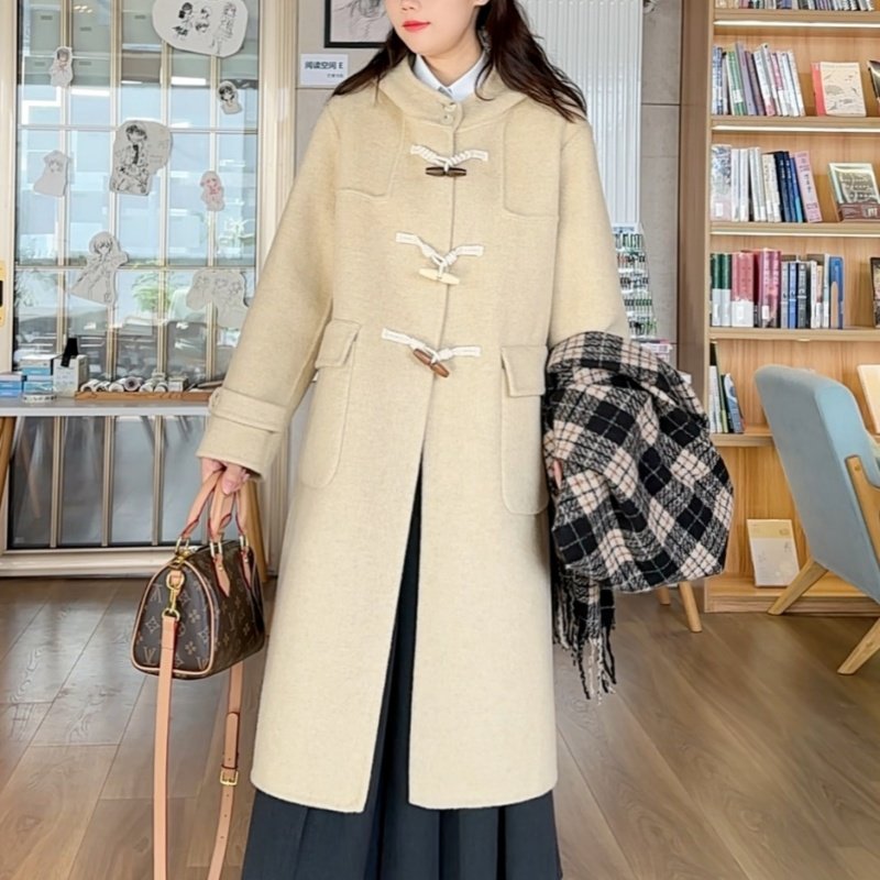 📚 连帽牛角扣双面羊毛大衣女2025秋冬新款小个子百搭显瘦毛呢外套