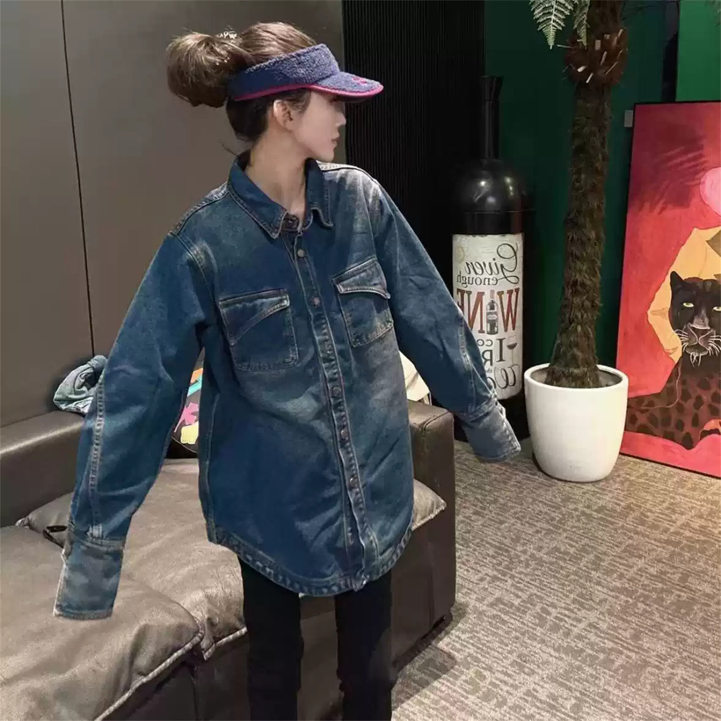📚 复古正肩款加绒加厚牛仔衬衫女秋冬季韩版休闲宽松长袖衬衣厚外套