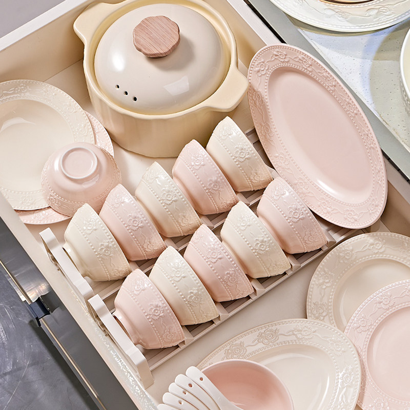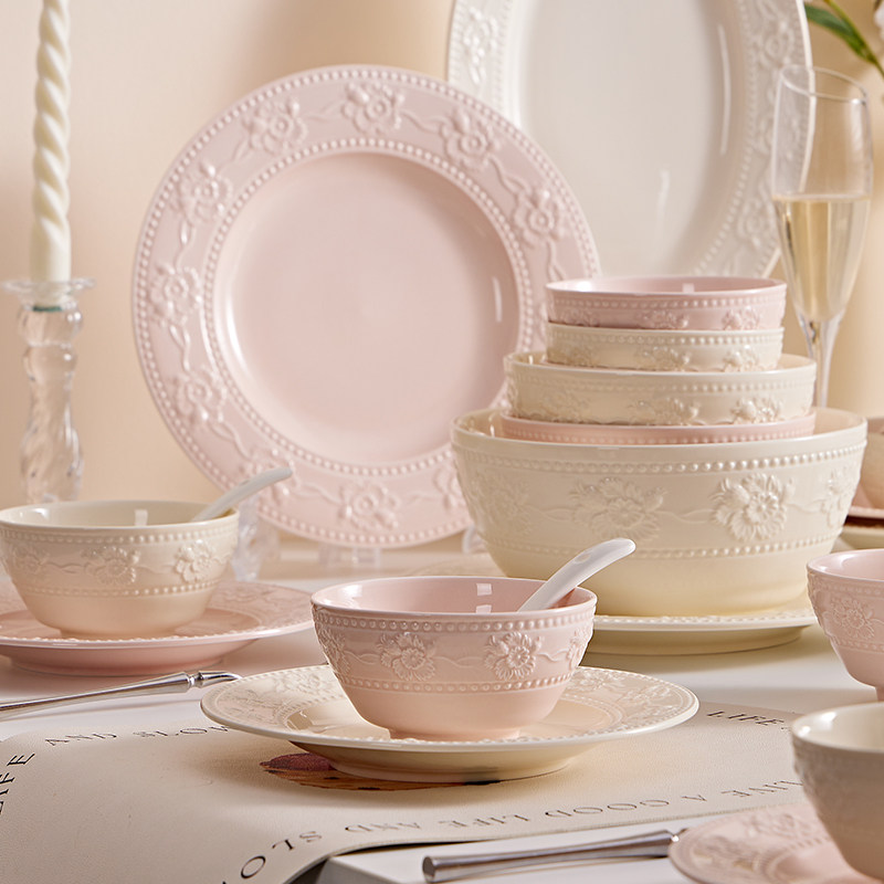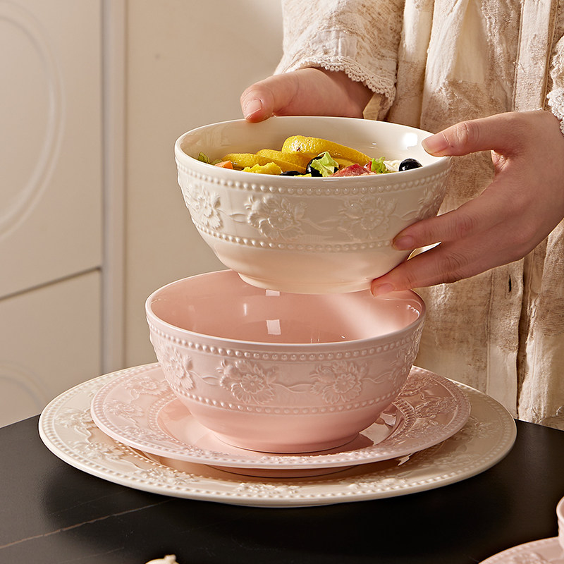 📚 法式浮雕餐具米饭碗家用2025新款奶油风碗盘组合餐盘大盘子汤面碗