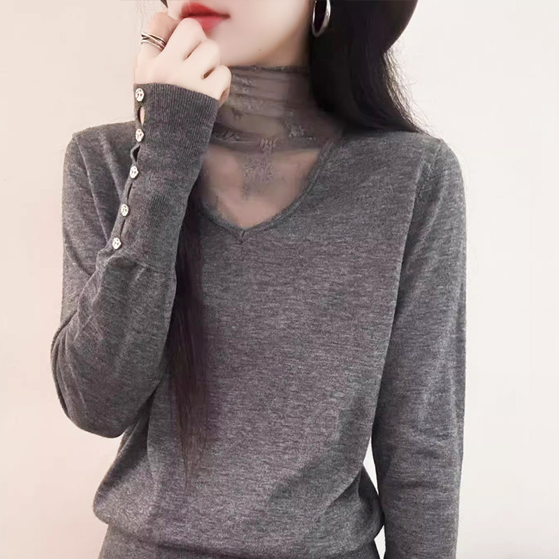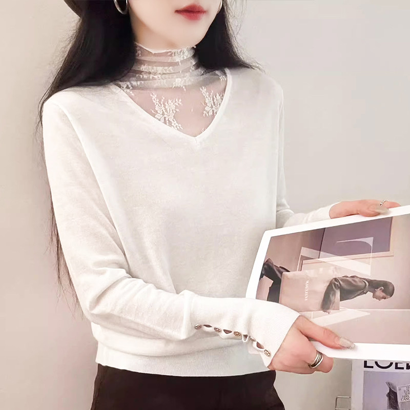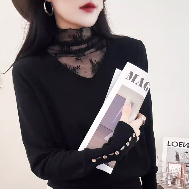 📚 90%羊毛2026新款高领蕾丝拼接纽扣宽松百搭打底针织衫上衣女