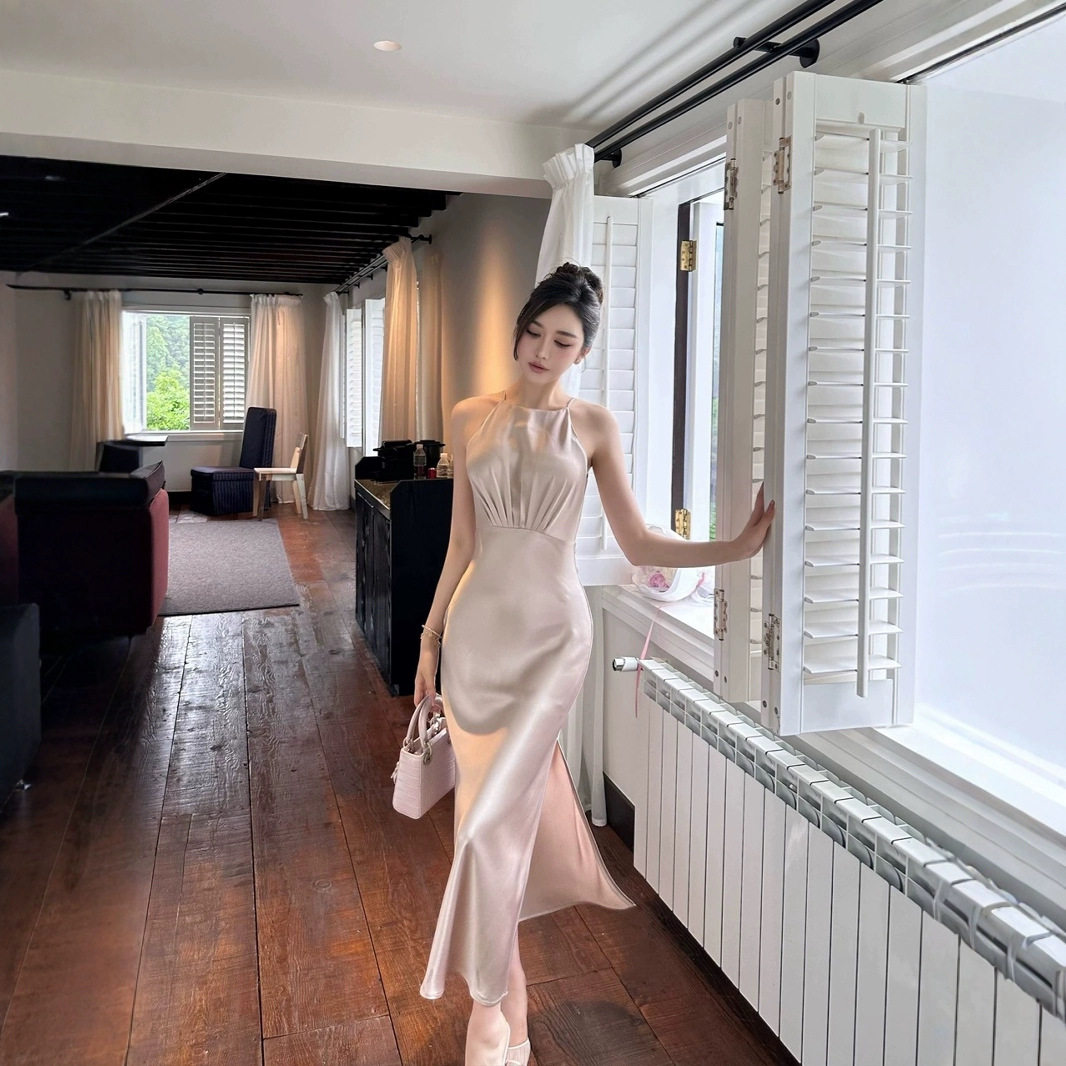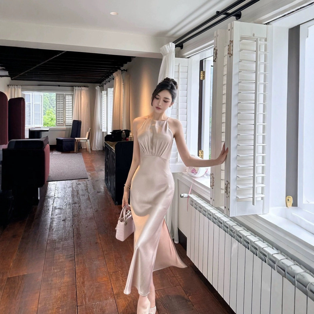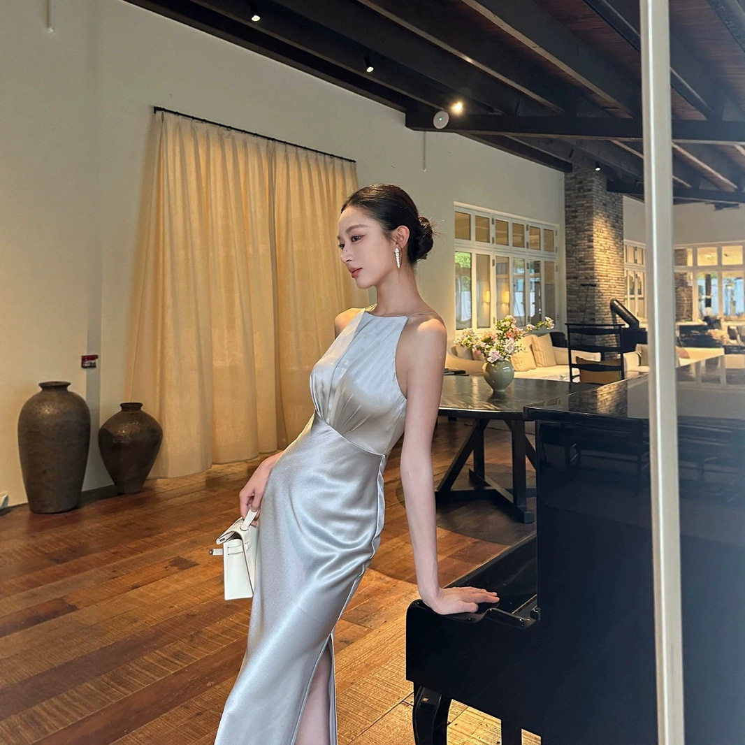 📚 SX善喜高级感醋酸缎面无袖修身包臀连衣裙收腰显瘦开叉气质礼服裙