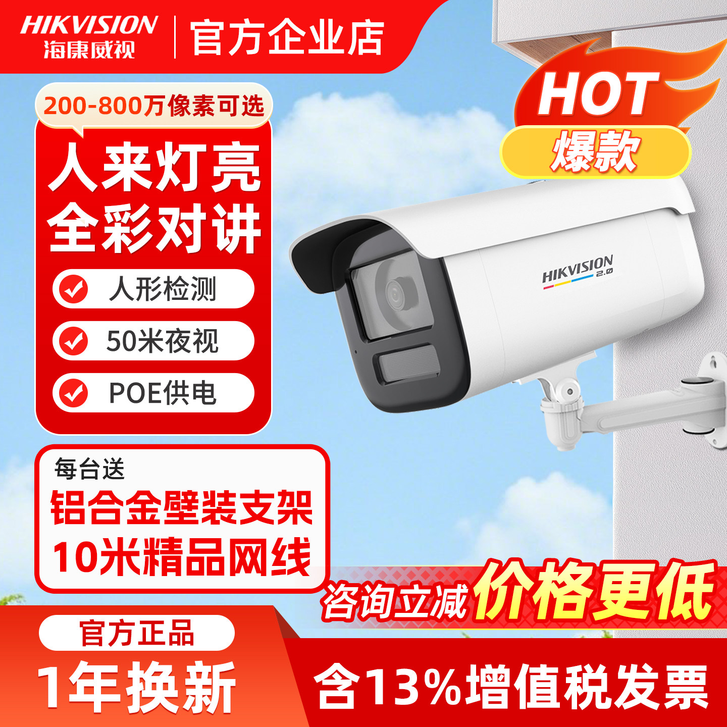 📚 海康威视监控摄影头400万家用商用高清摄像头POE供电全彩室外枪机