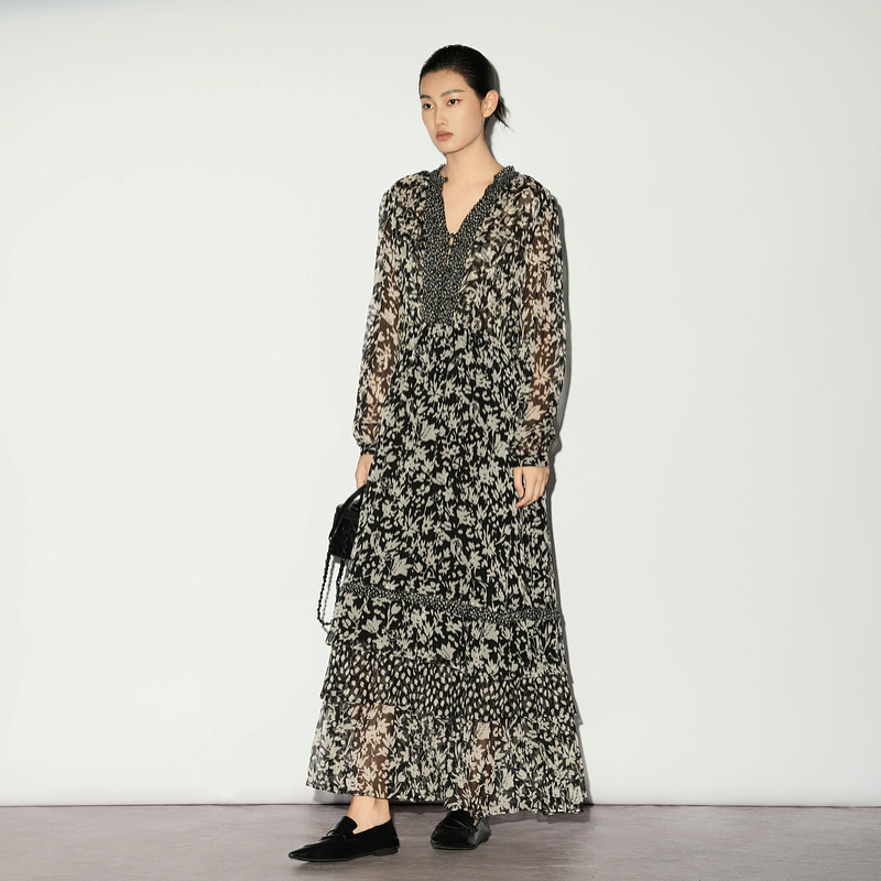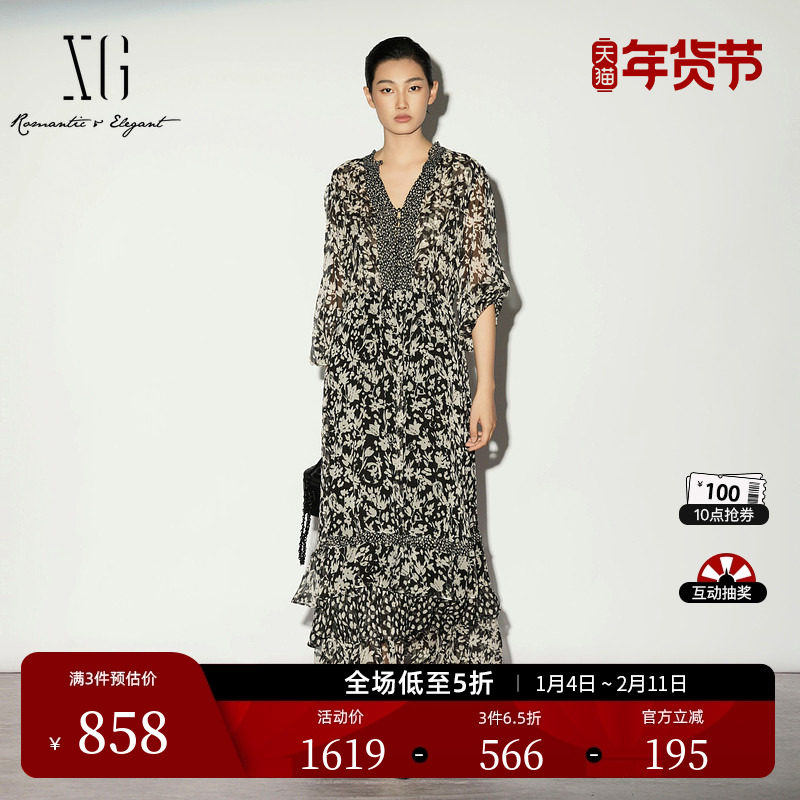 📚 XG雪歌花版高腰连衣裙2026春季新款 碎花V领灯笼袖中袖长伞裙女装
