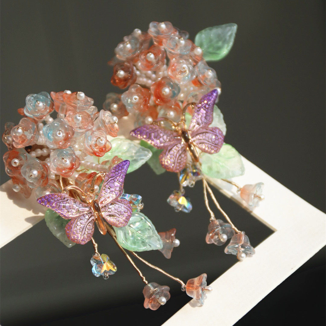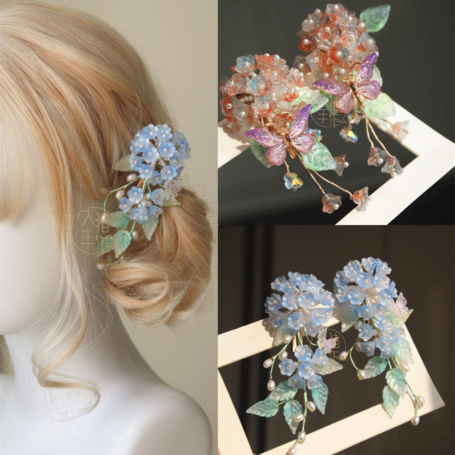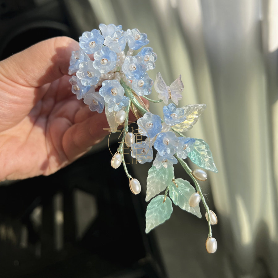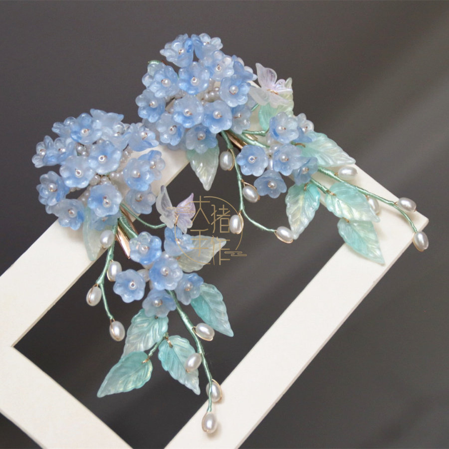 📚 复古国风无尽夏蓝色琉璃绣球花枝花球边夹发簪子汉服旗袍配饰发饰