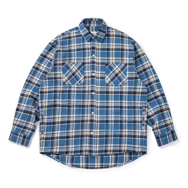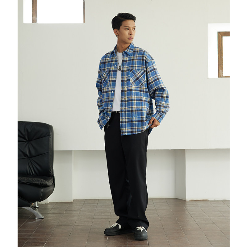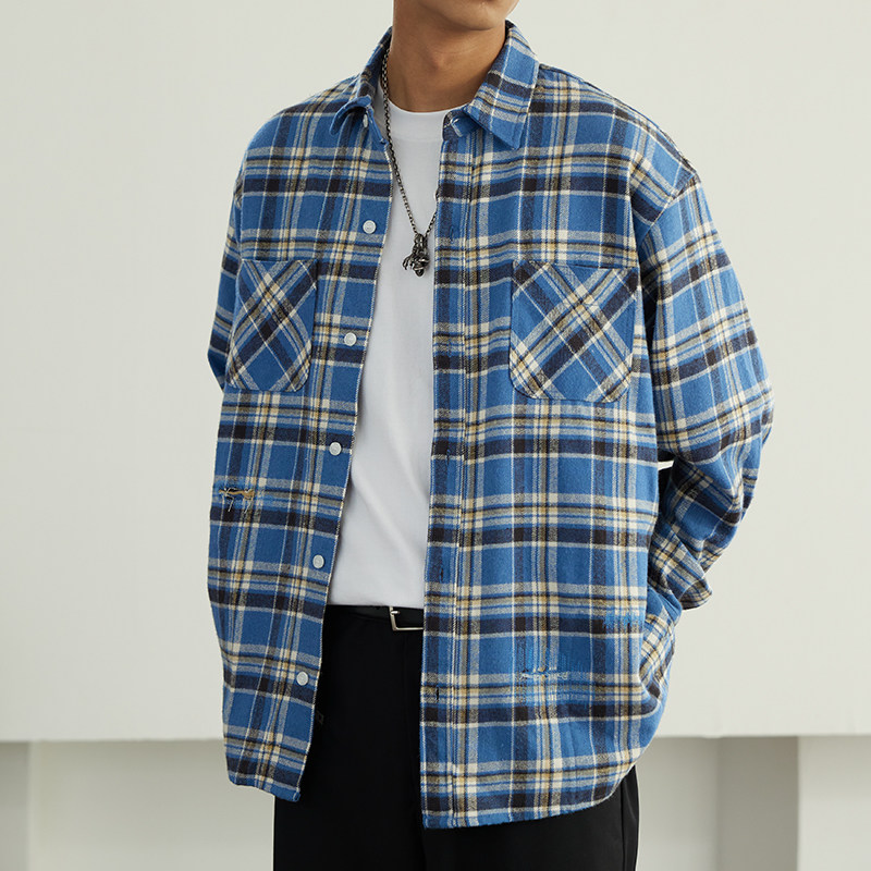 📚 VMCL 破坏水洗蓝色格子日系复古长袖衬衫外套男秋23AW vermicelli