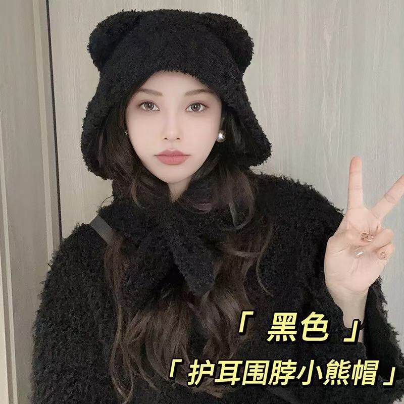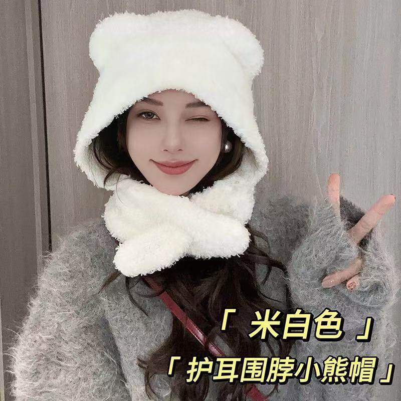 📚 围脖帽子一体两件套毛绒小熊耳朵针织毛线帽秋冬保暖护耳雷锋帽女