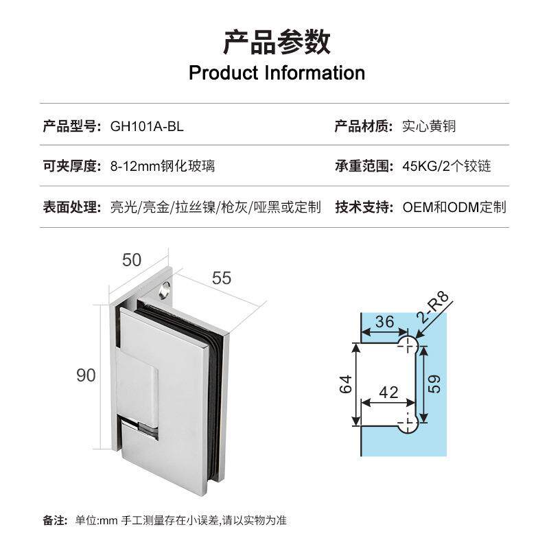 📚 弹簧铰链浴室淋浴房全铜铰链可调节玻璃门90度侧装铰链GH101A-BL