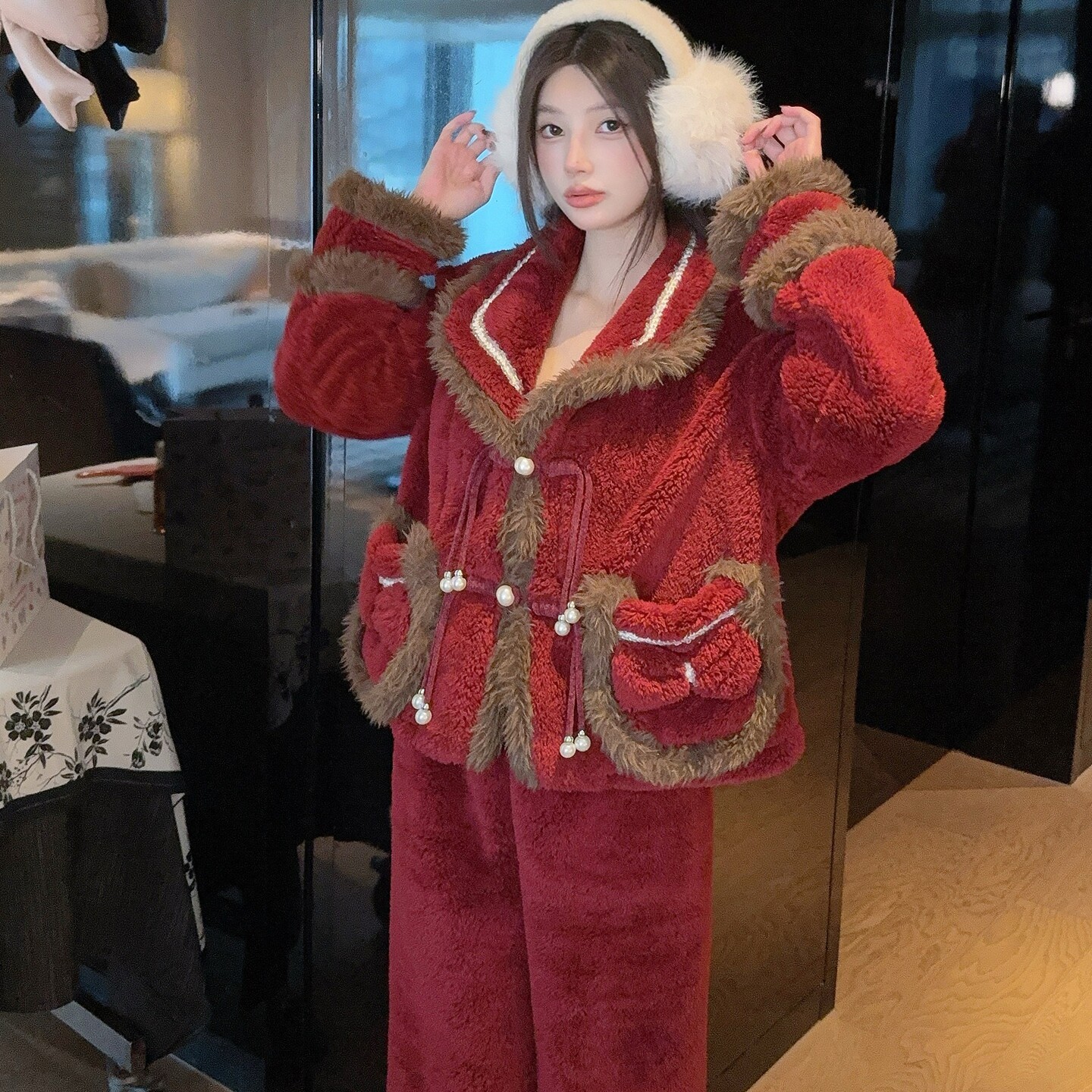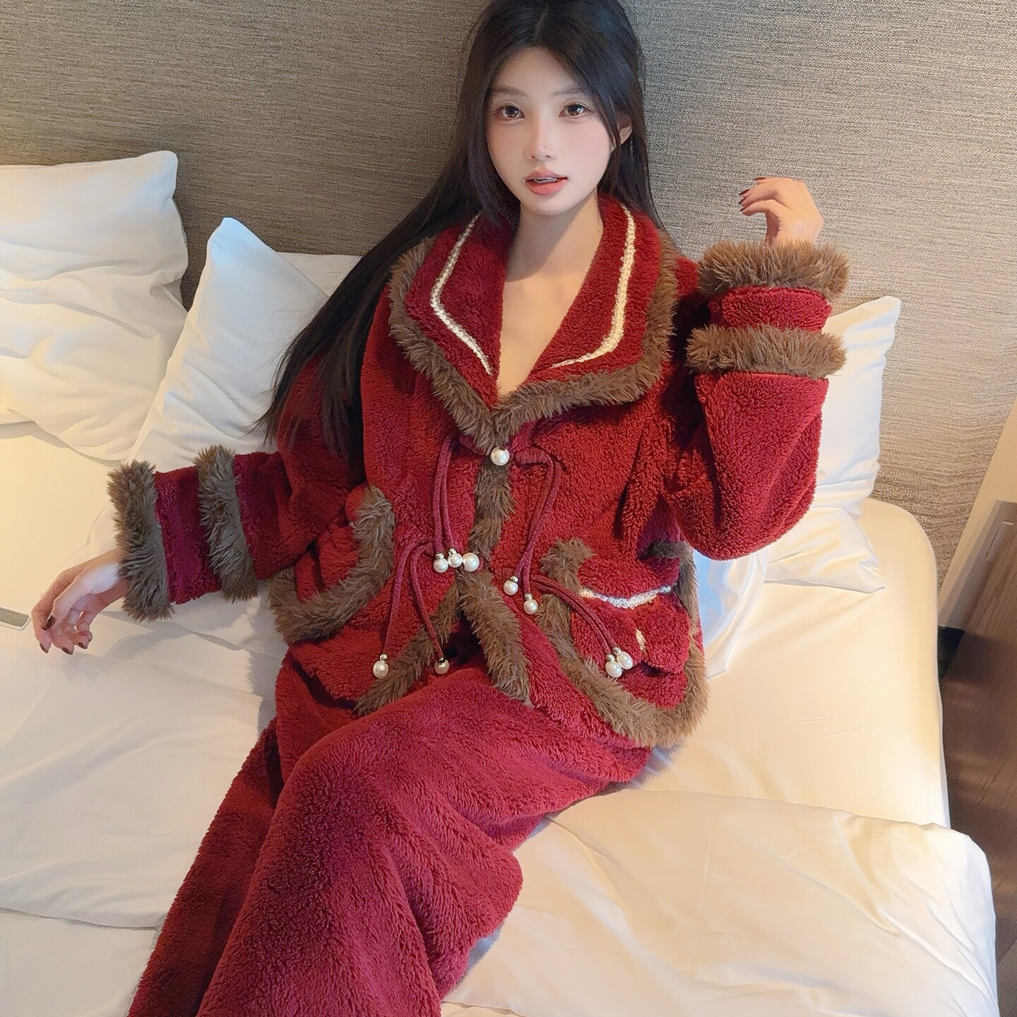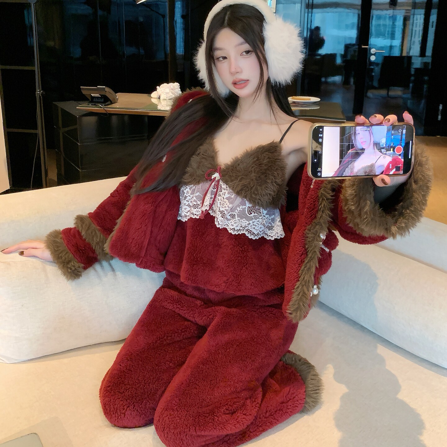 📚 圣诞新年红色睡衣女秋冬珊瑚绒加厚洋气带胸垫性感可外穿家居服