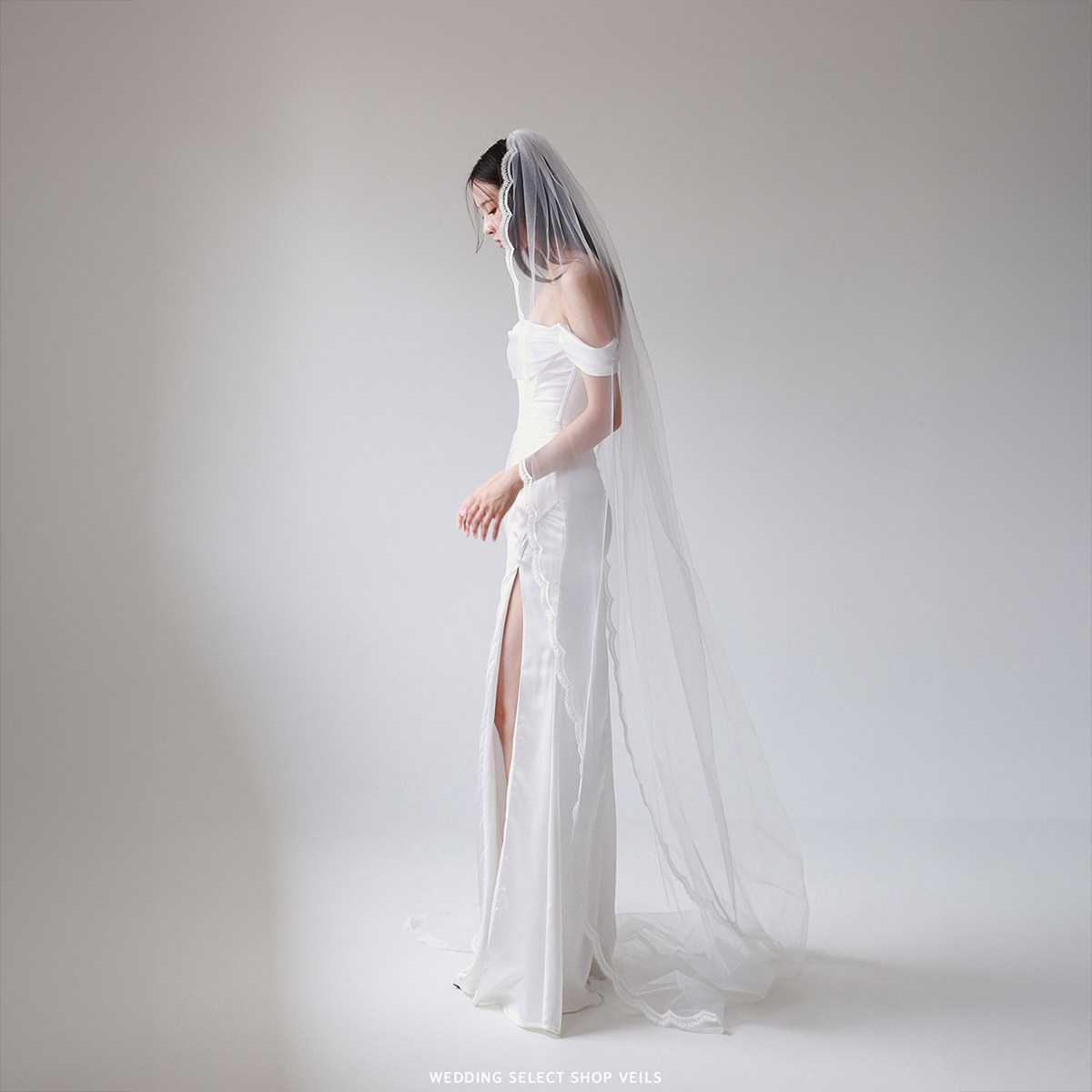 📚 Veils复古波浪蕾丝边长款单层拖地头纱新娘教堂婚礼高级手缝发饰