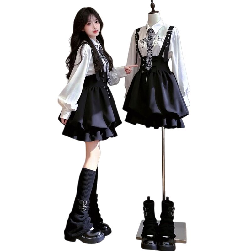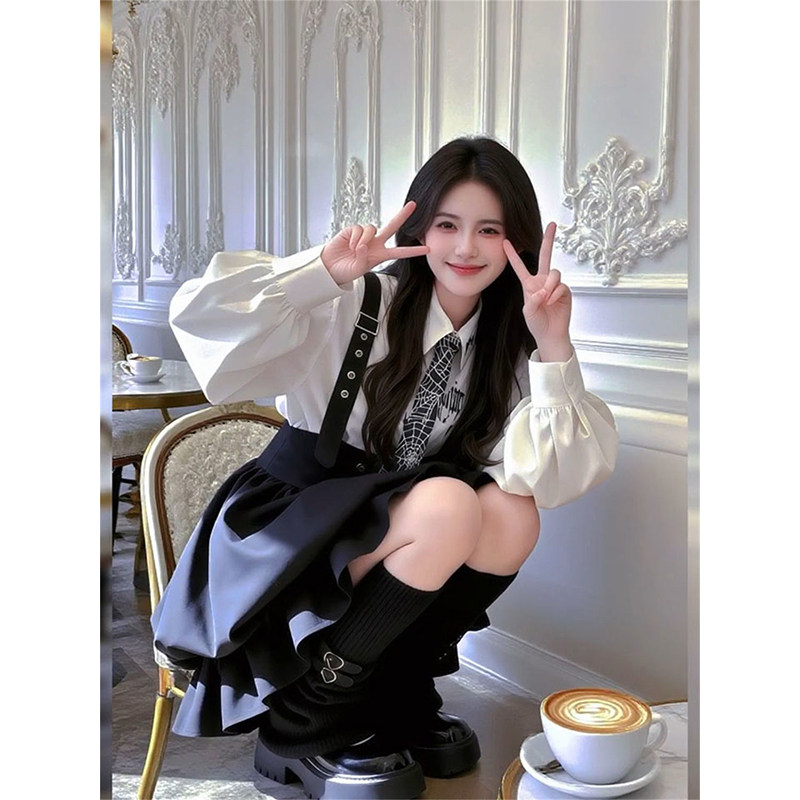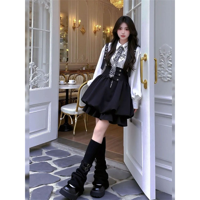 📚 韩版时尚甜美学院风白色印花衬衫+黑色背带花苞裙送领带两件套装