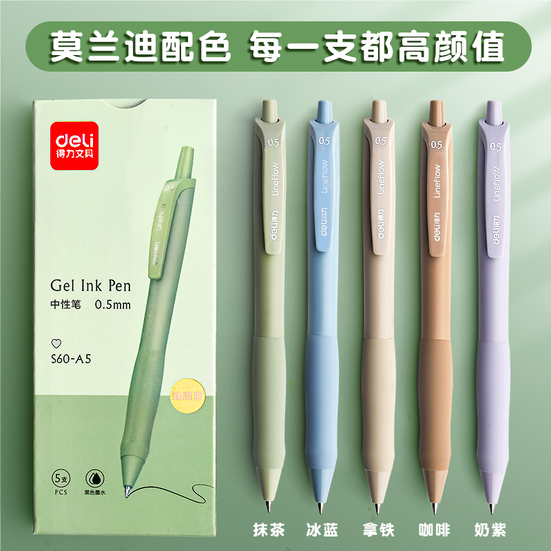 📚 得力S60-A学生中性笔0.5黑色子弹头考试臻顺滑莫兰迪色按动商务办公签字笔油墨水性笔圆珠笔书写刷题用走珠笔