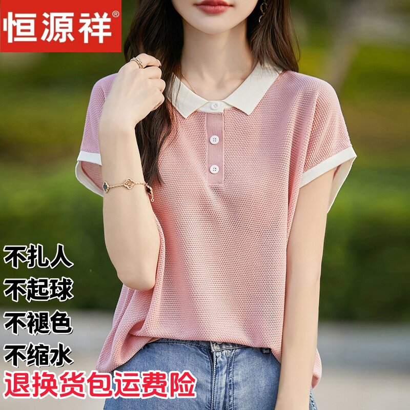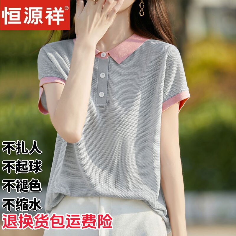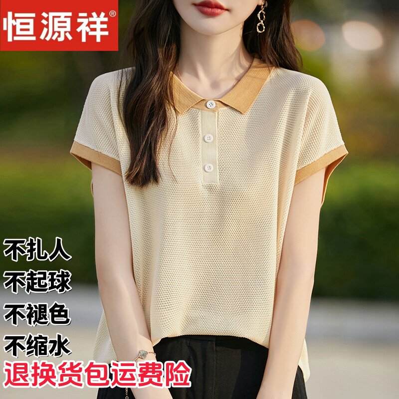 📚 恒源祥女装法式POLO领撞色针织短袖女夏宽松百搭减龄上衣套头柔软