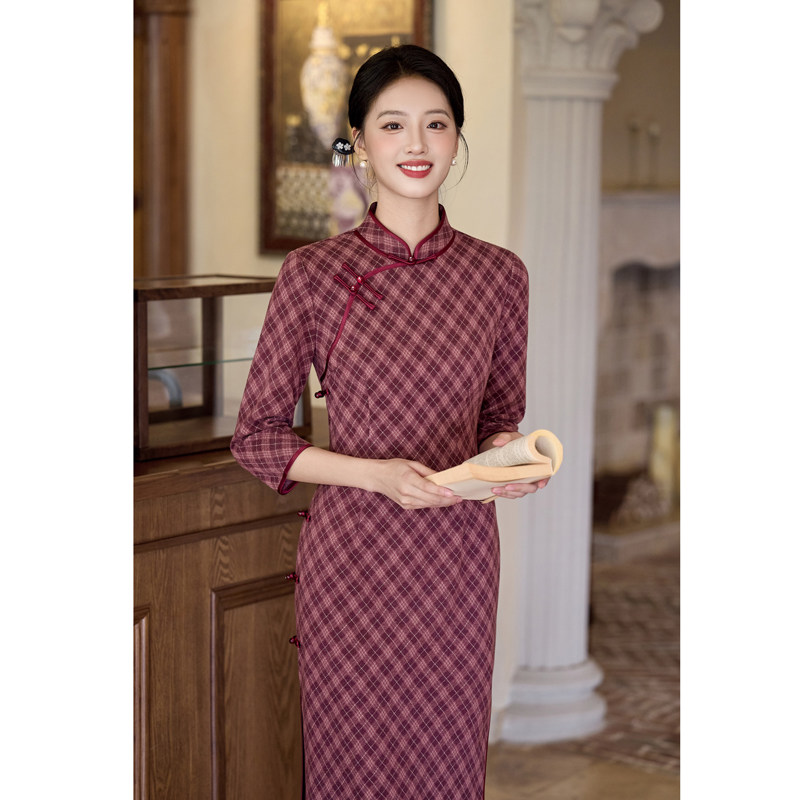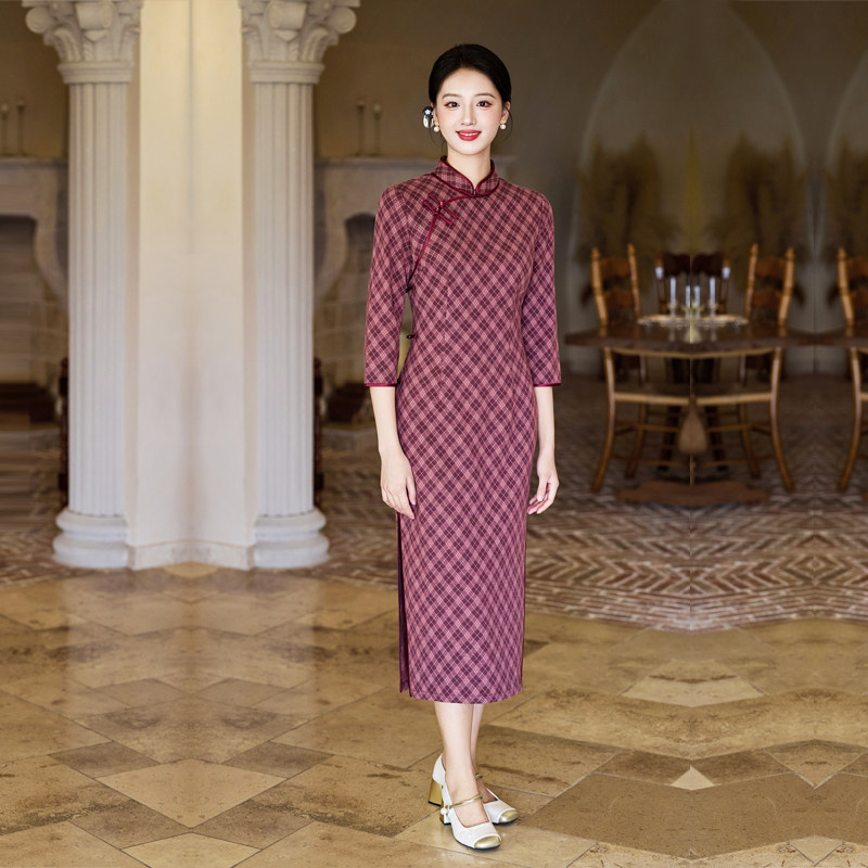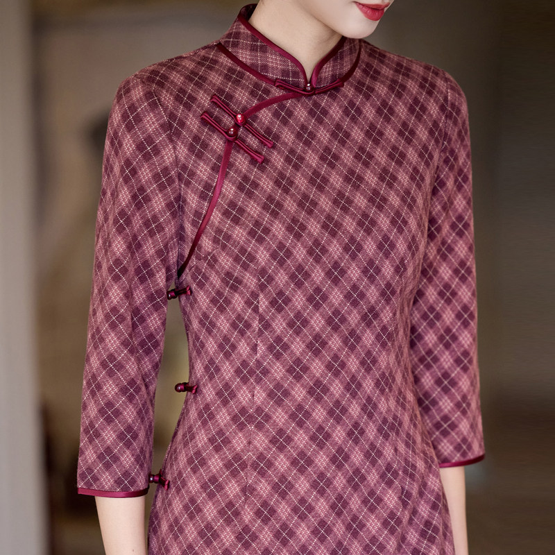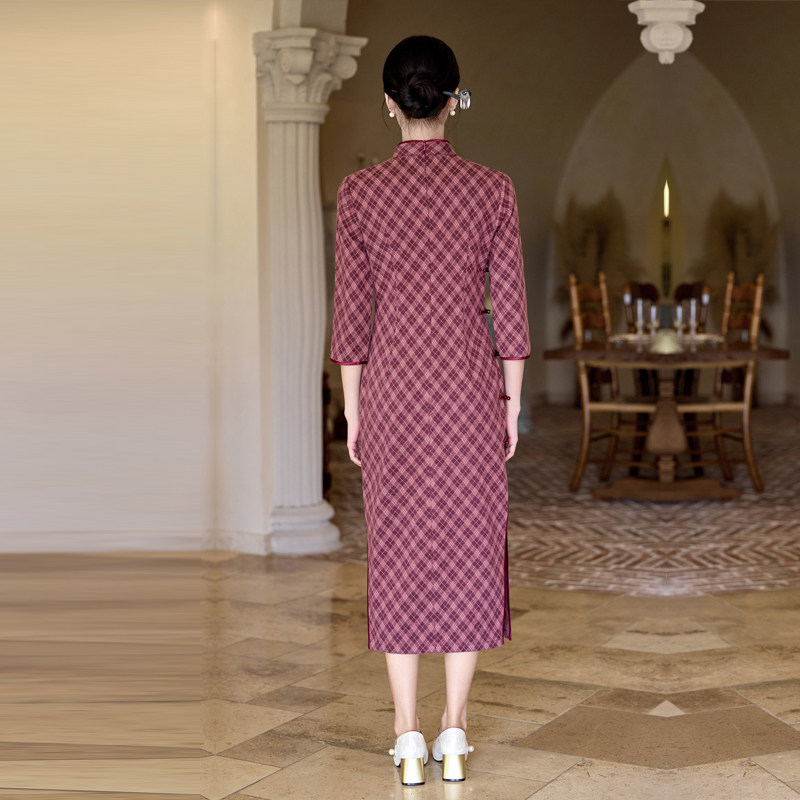 📚 红小格子旗袍复古民国风中年女妈妈7分长袖日常秋装高级胖mm大码
