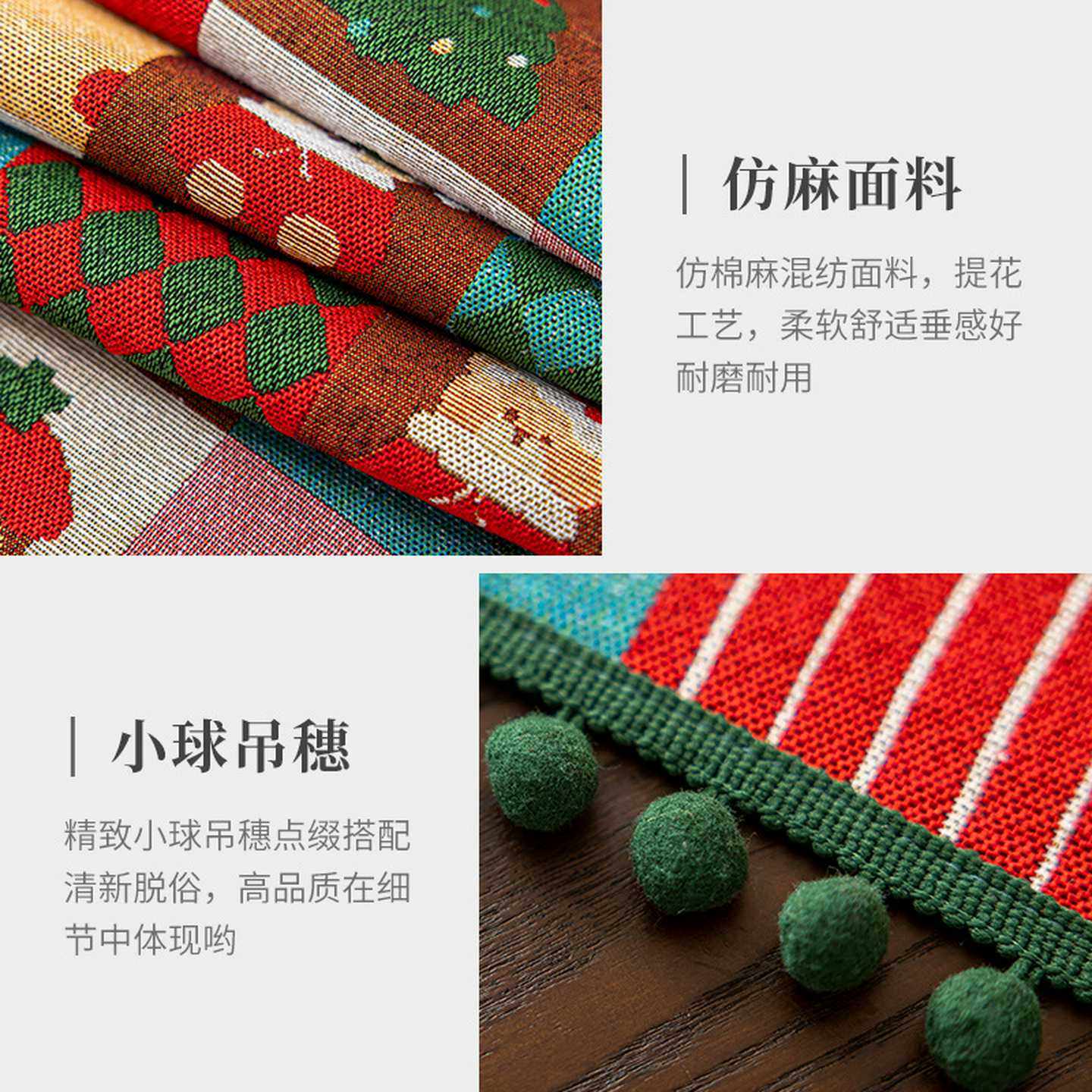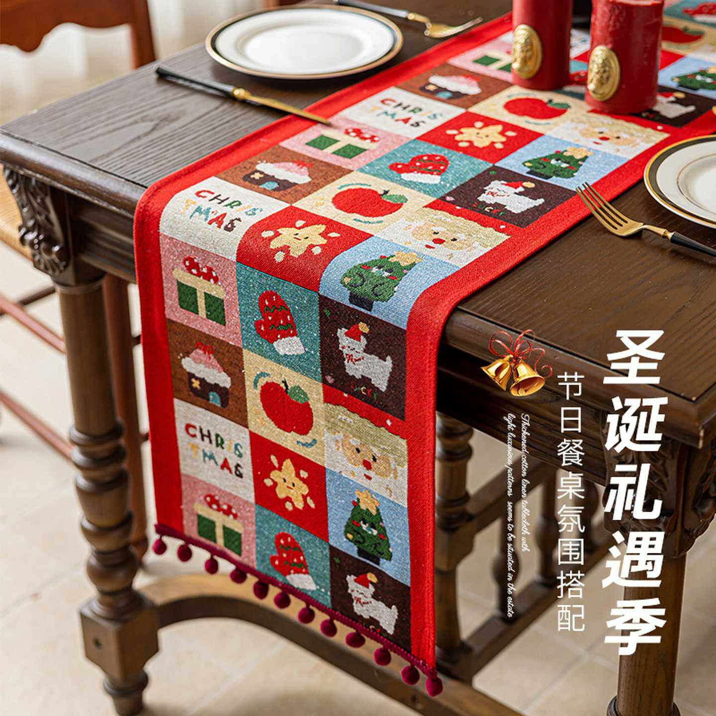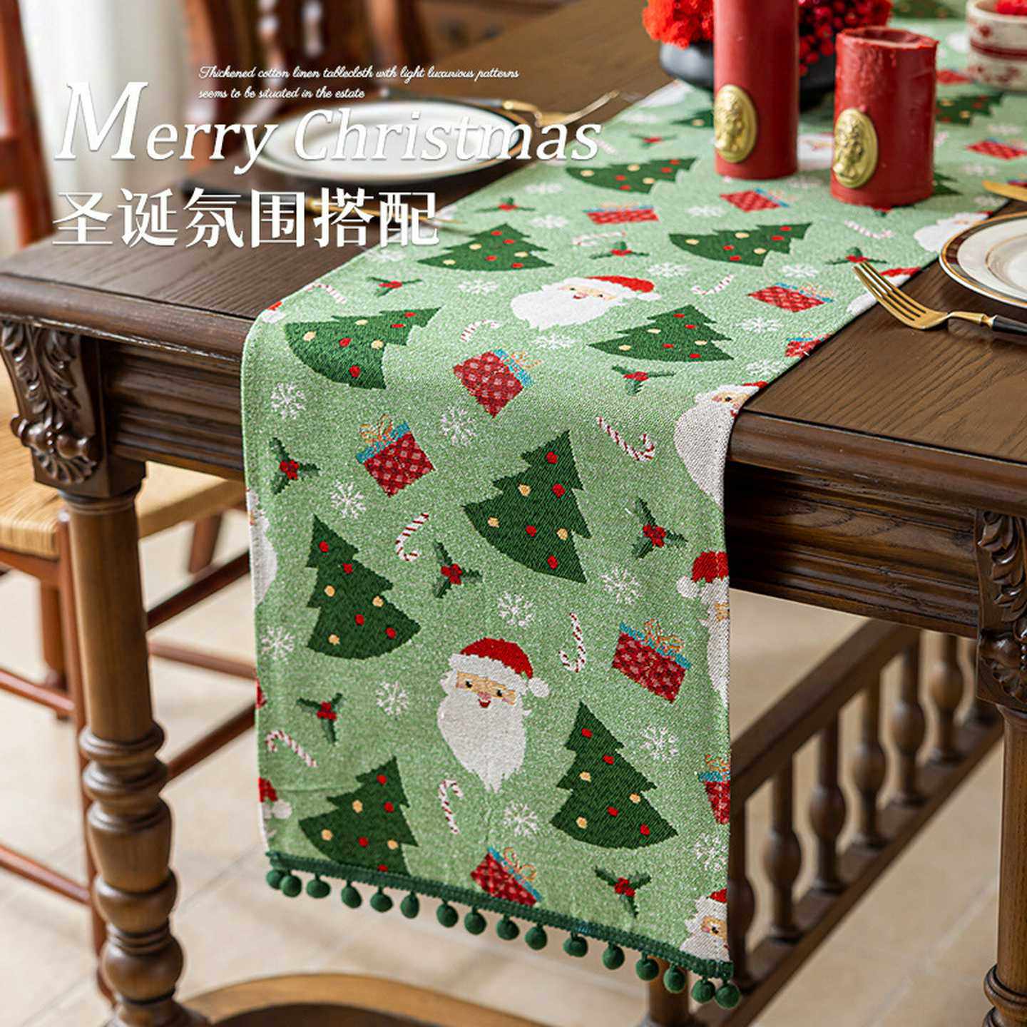 📚 跨境新款圣诞老人餐桌布氛围感装饰仿棉麻六人桌长条布圣诞节桌旗