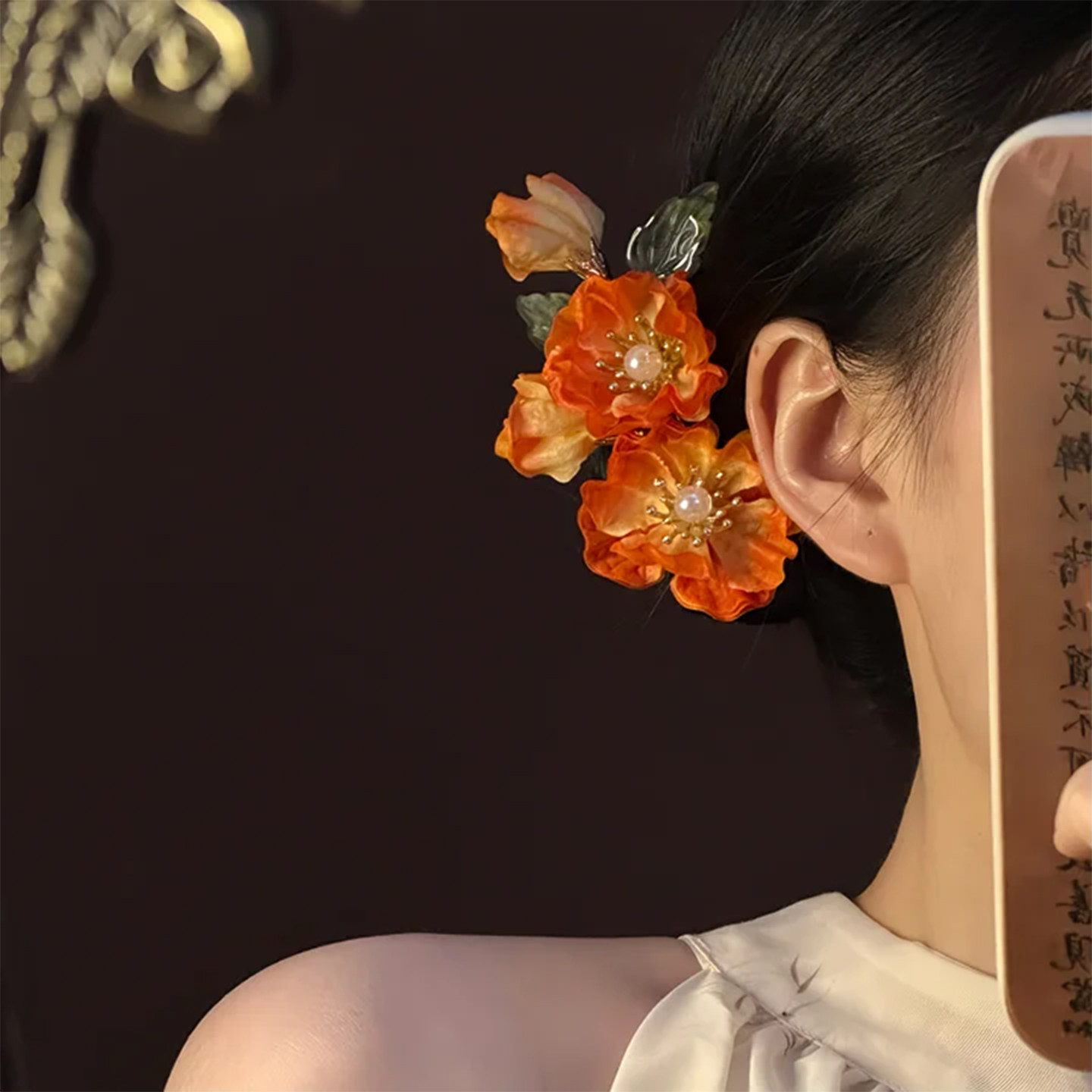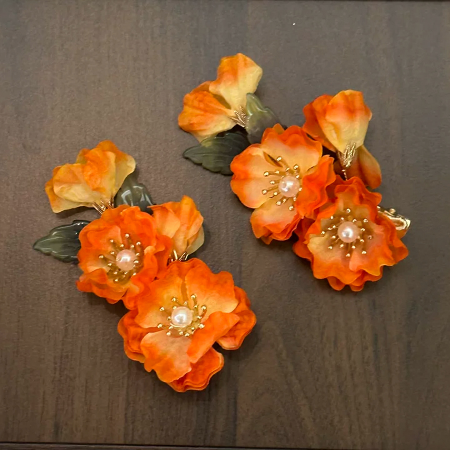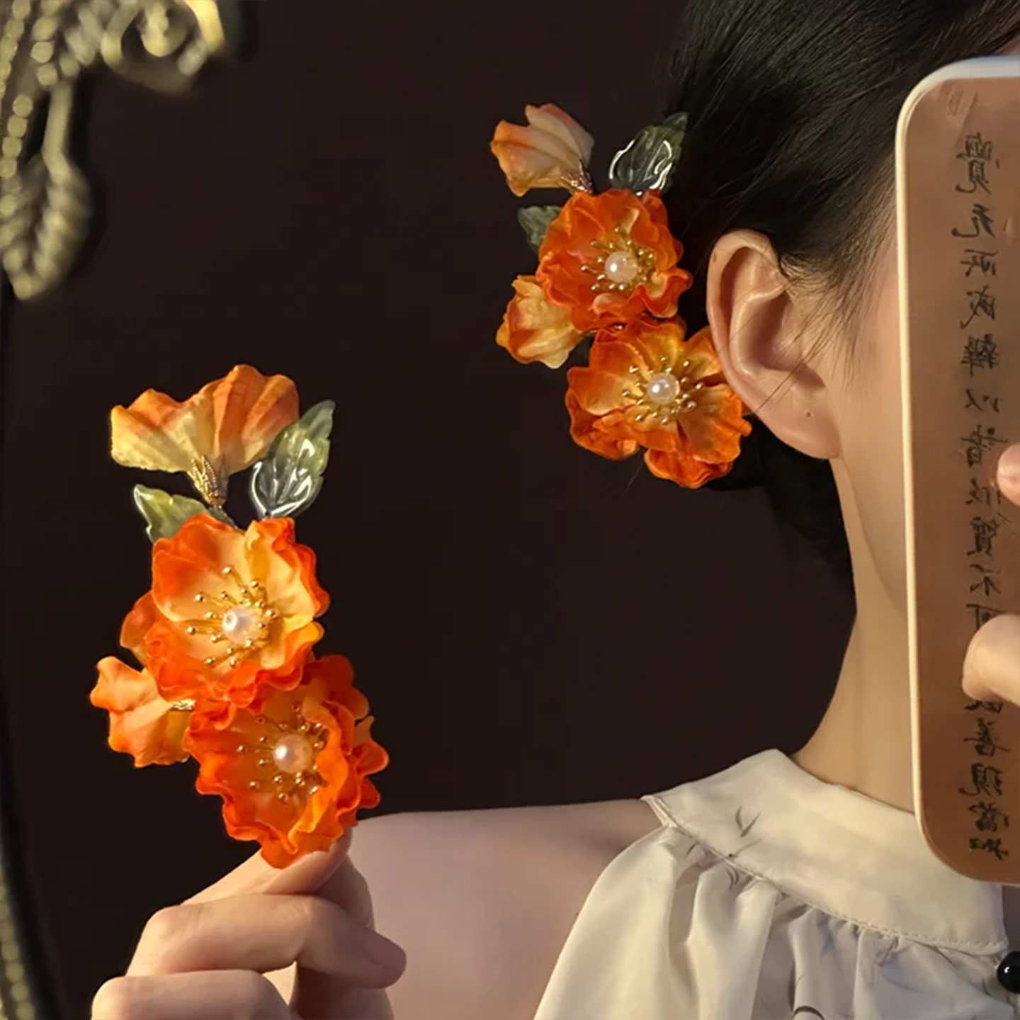 📚 山沐手作「落日晚棠」非遗橘色绒花发夹女新中式头饰新娘订婚发饰
