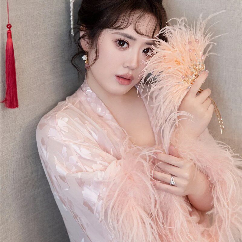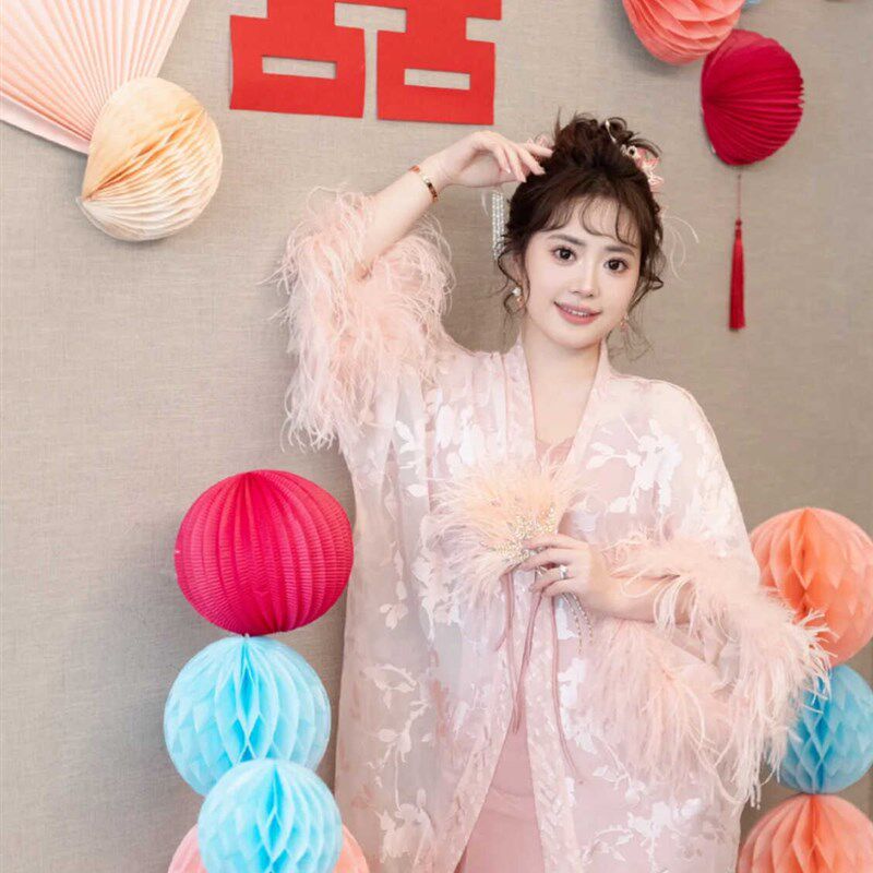 📚 新中式晨袍新娘结婚仙女粉色高级感驼鸟毛睡衣睡袍春秋羽毛可拆卸
