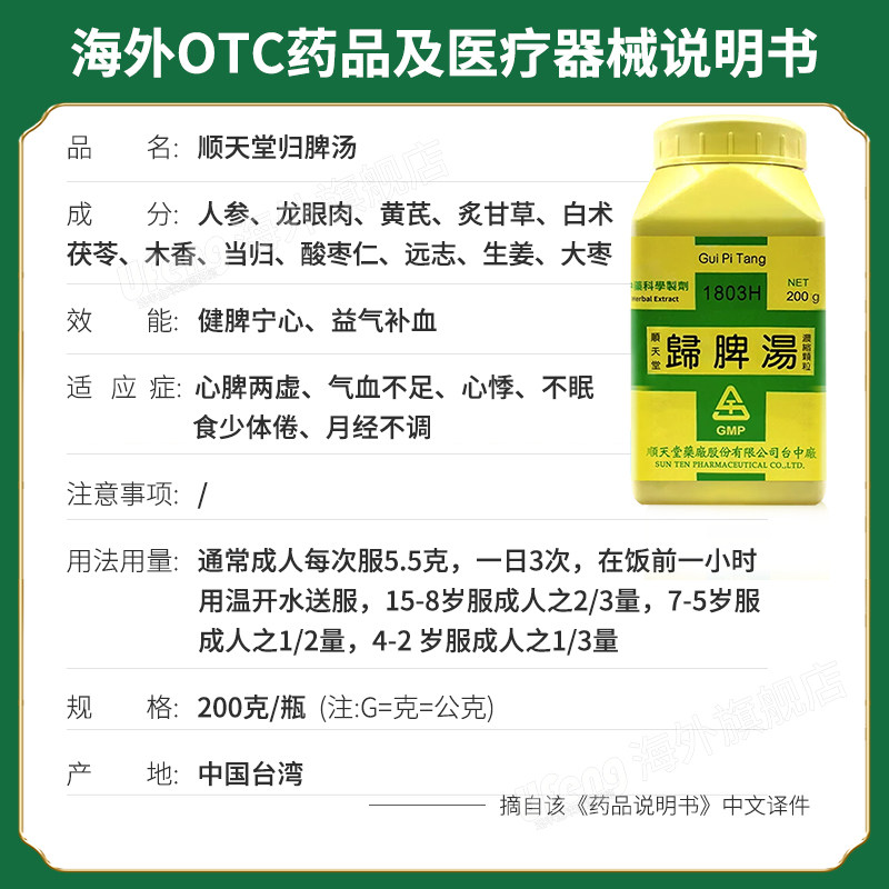 📚 顺天堂归脾汤200g台湾心脾两虚气血不足心悸不眠食少体倦月经不调