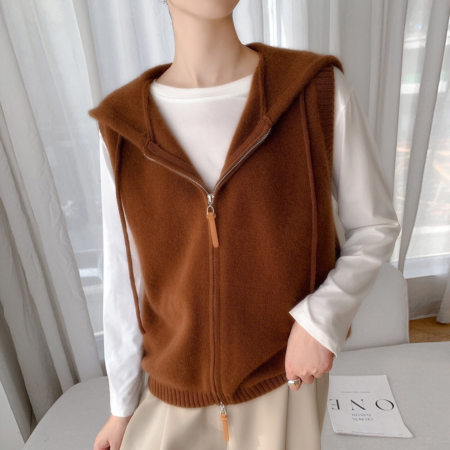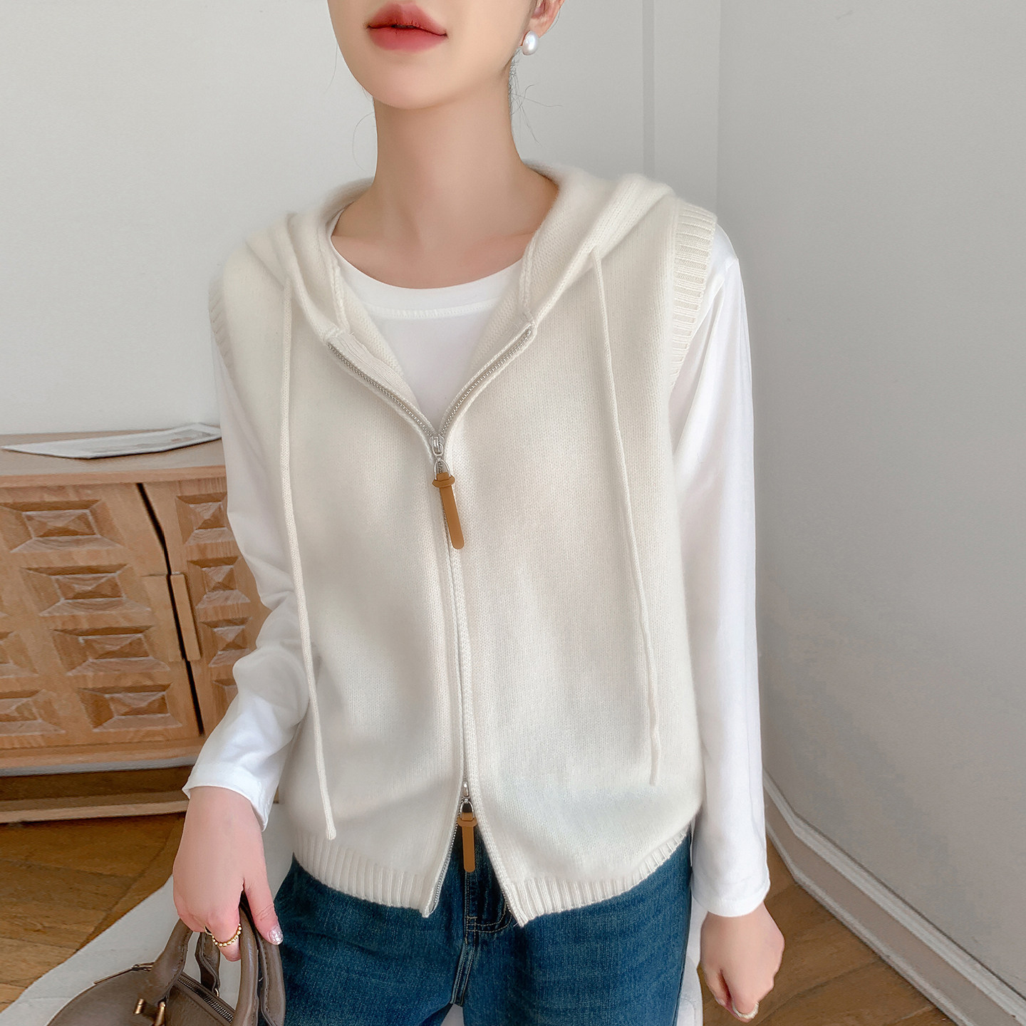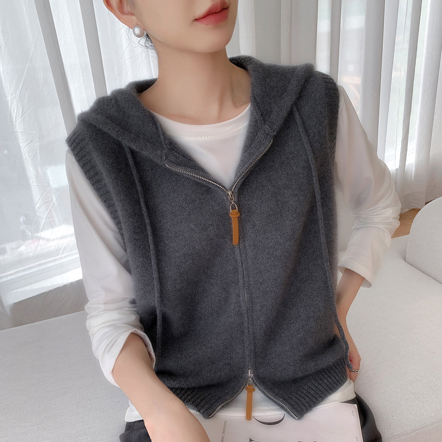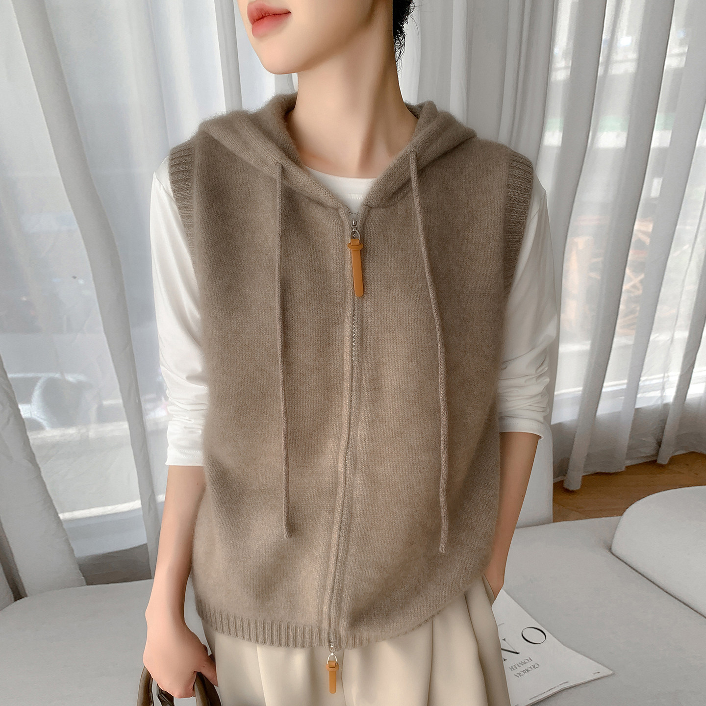 📚 秋冬款100%纯羊毛针织厚马甲女连帽拉链无袖毛衣背心坎肩开衫外套