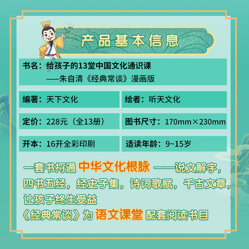 09¥ CZ009 lJvnUoX6BEx¥ https://m.tb.cn/h.7ylV3cr 朱自清经典常谈漫画版 给孩子的13堂中国文化通识课 全套13册 国学经典文化启蒙 小学生三四五六年级课外阅读书籍漫画讲透中华文化 --------------------- 【原售价】99元 【现售价】99元。