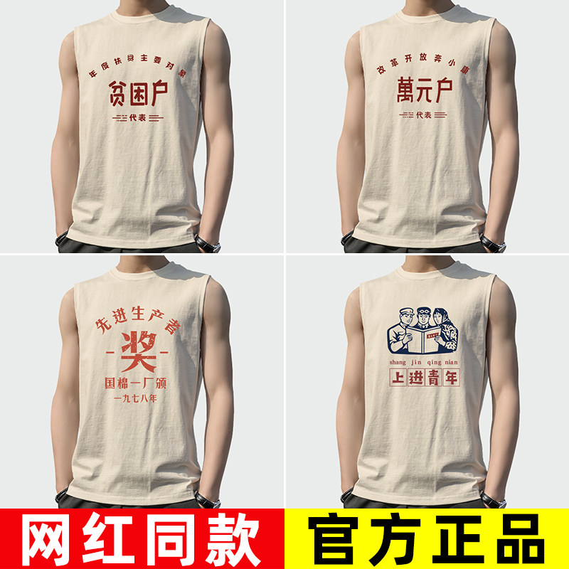 📚 无袖坎肩背心男t恤男士夏季复古怀旧生产队万元贫困户先进生产者T