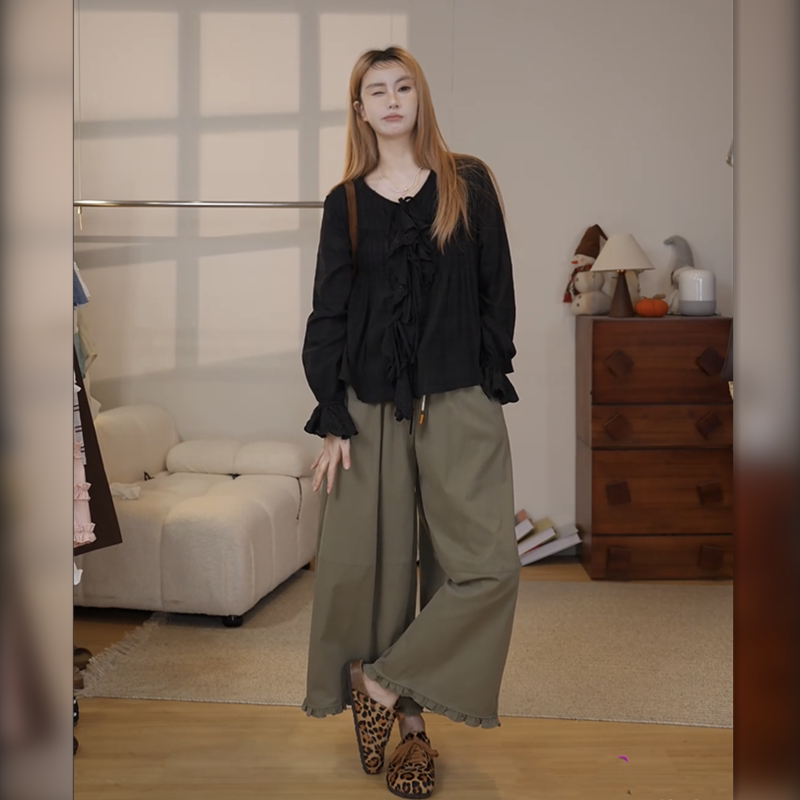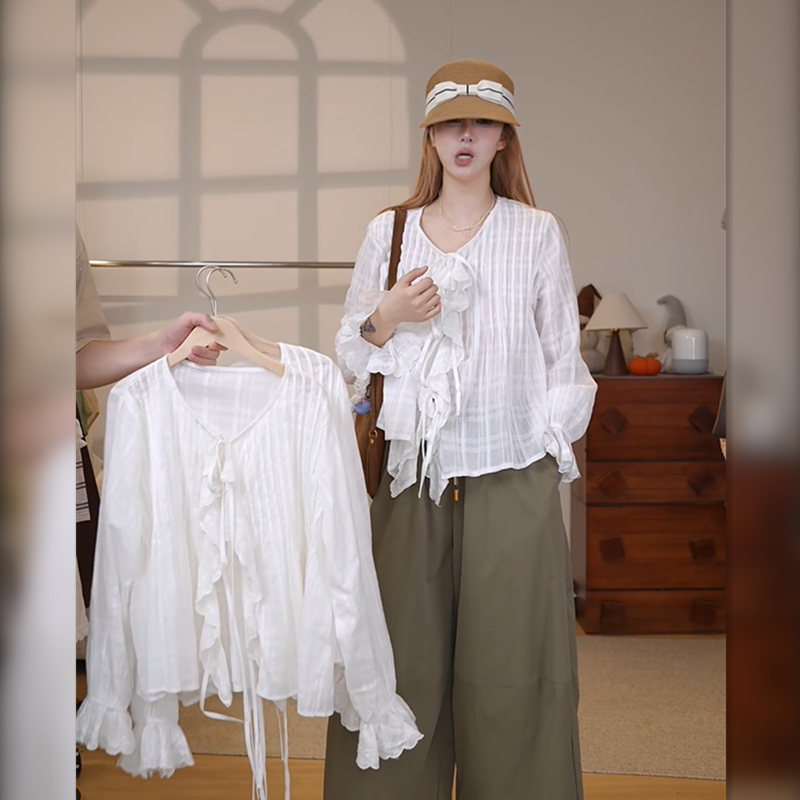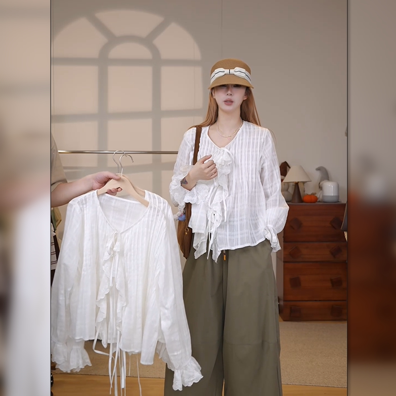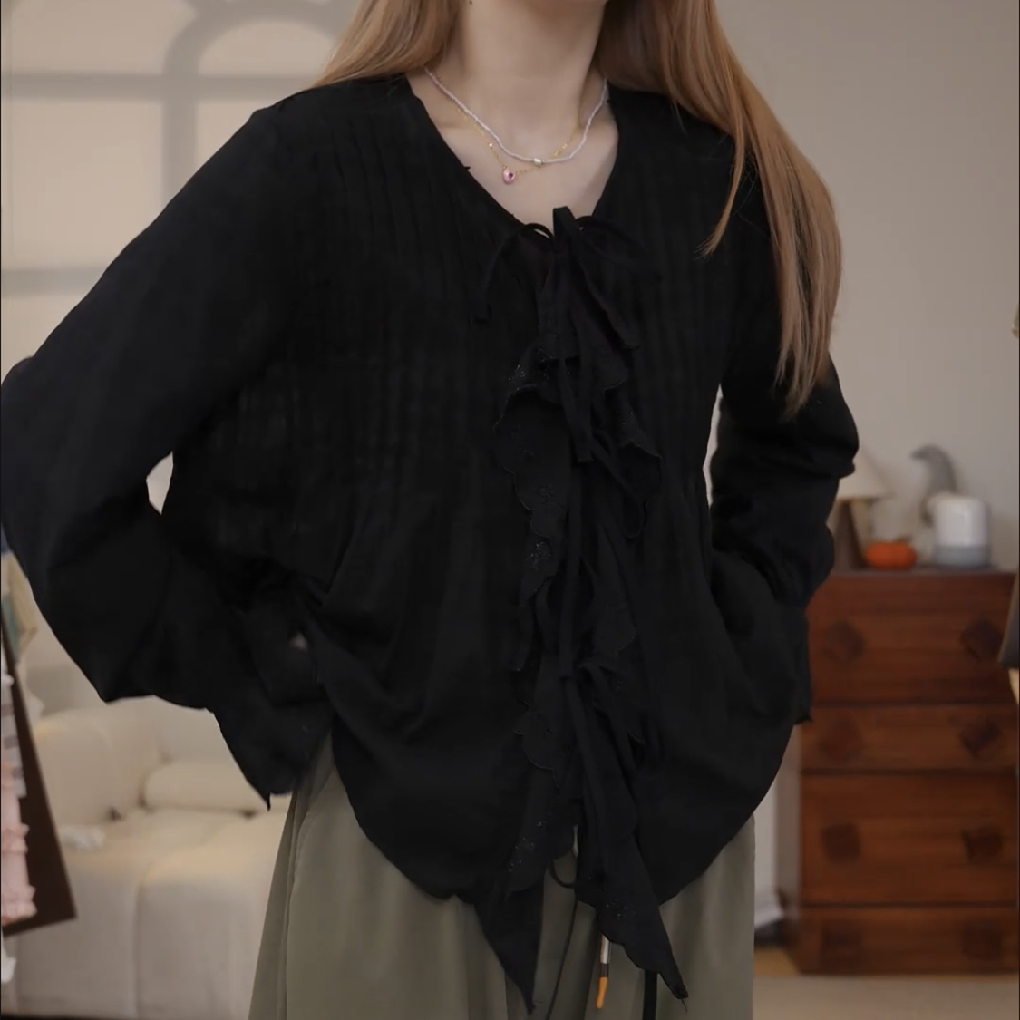 📚 高端货~荷叶边提花格子重工刺绣衬衫女初秋设计感气质系带上衣薄